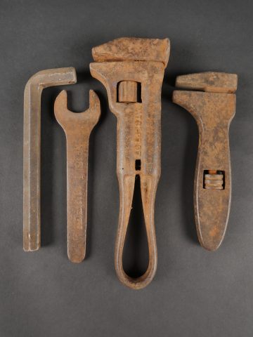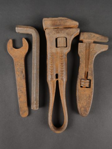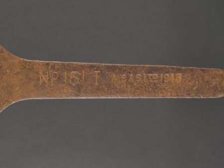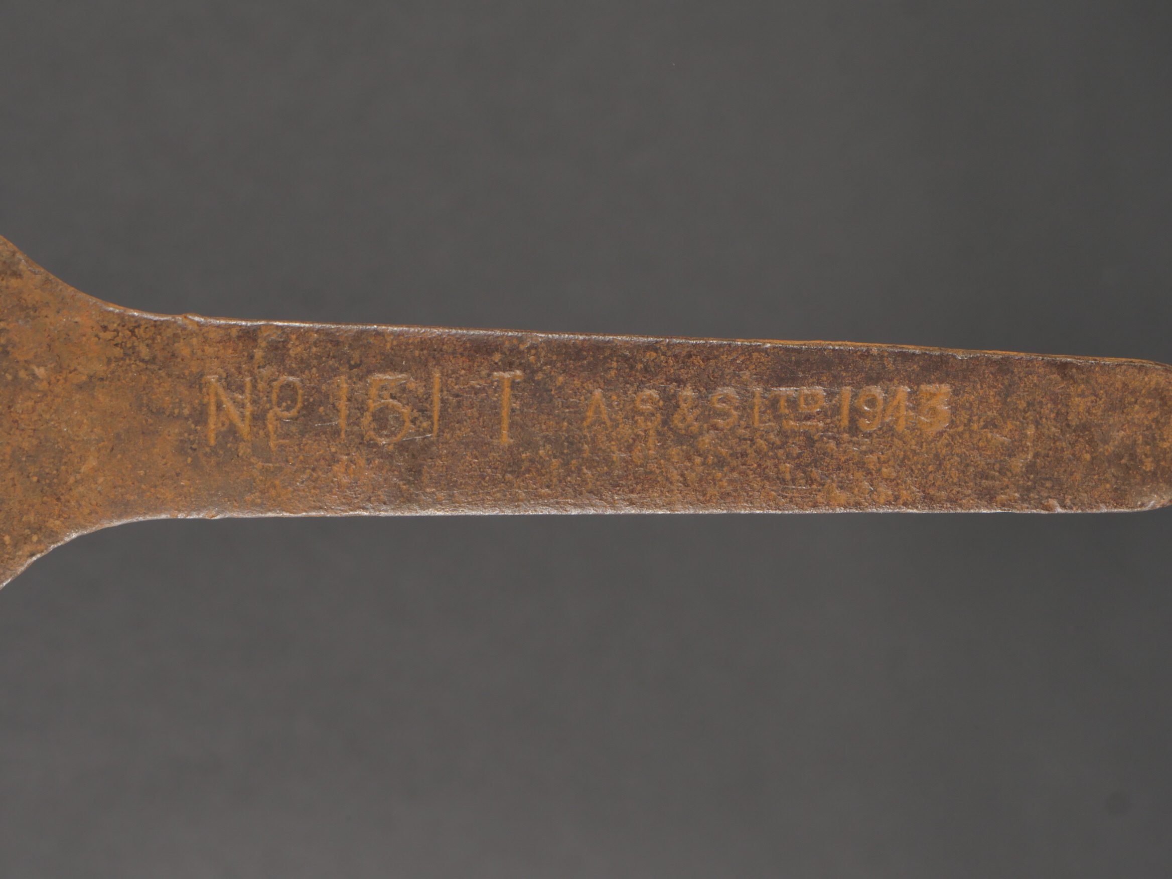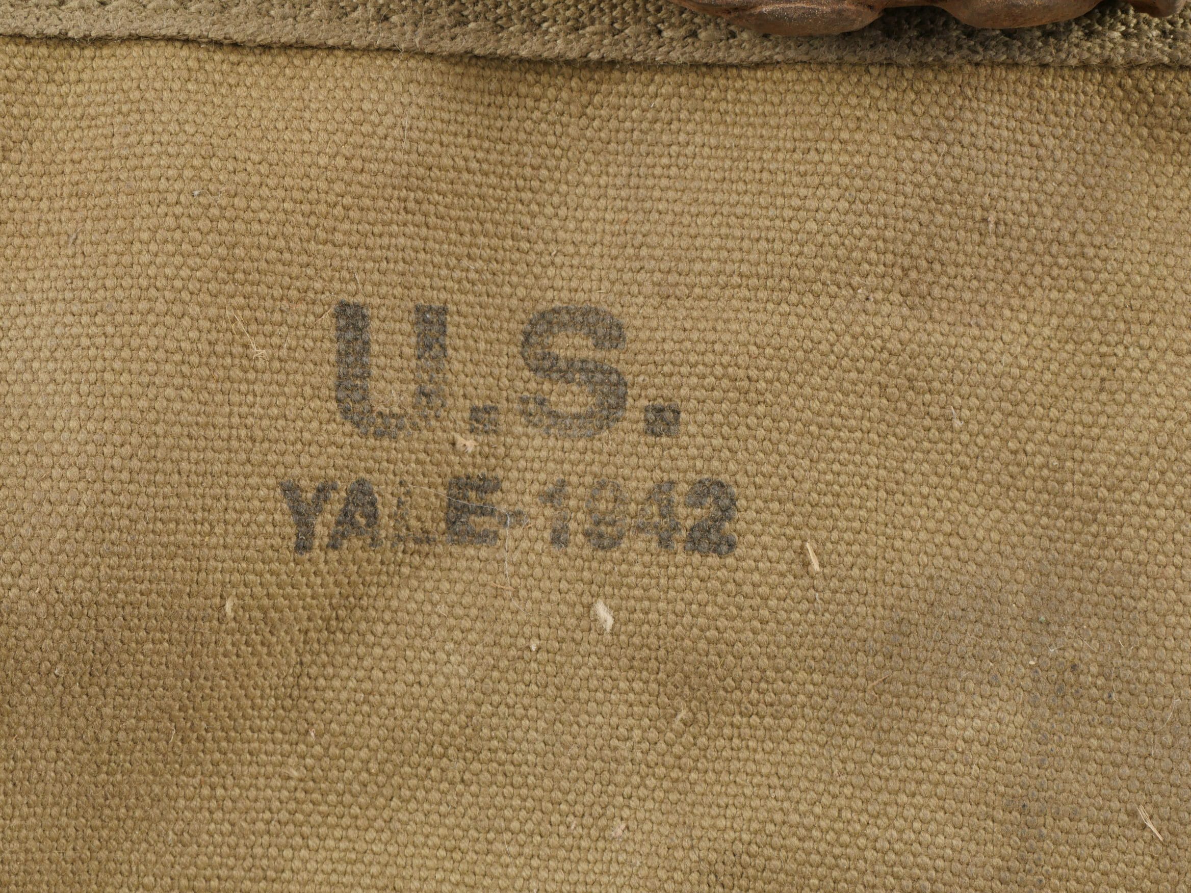 Détails de la vente >Trousse d’outillage US . Trousse en toile datée 1942 avec 2 clés à mollette, clé plate, clé coudée.