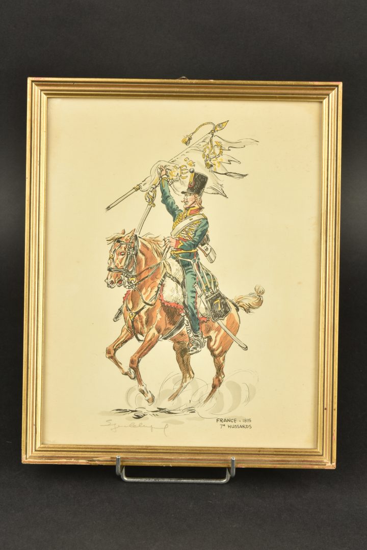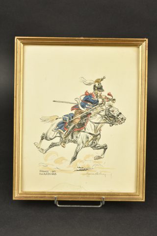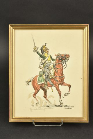 Ensemble de gravures Premier Empire. Suite de 6 gravures en couleurs encadrées représentant des cavaliers du Premier Empire : 3e chevau-légers lanciers, dragons 1815, 1er et 22e dragons 1806, 7e hussards 1815, garde impériale gendarmerie d’élite 1808 et cuirassiers 1815. Toutes signées au crayon, quelques tâches et marques d’humidités. Dimensions 26x32cm.