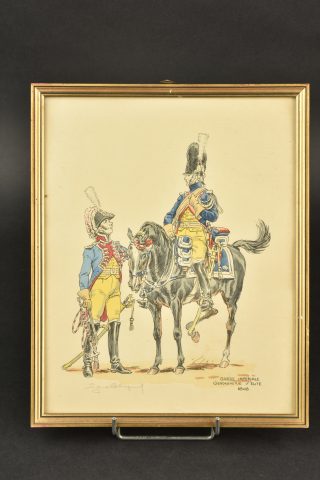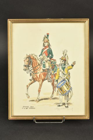 Détails de la vente >Ensemble de gravures Premier Empire. Suite de 6 gravures en couleurs encadrées représentant des cavaliers du Premier Empire : 3e chevau-légers lanciers, dragons 1815, 1er et 22e dragons 1806,... en savoir plus