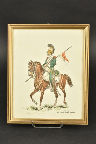 Ensemble de gravures Premier Empire. Suite de 6 gravures en couleurs encadrées représentant des cavaliers du Premier Empire : 3e chevau-légers lanciers, dragons 1815, 1er et 22e dragons 1806,... en savoir plus