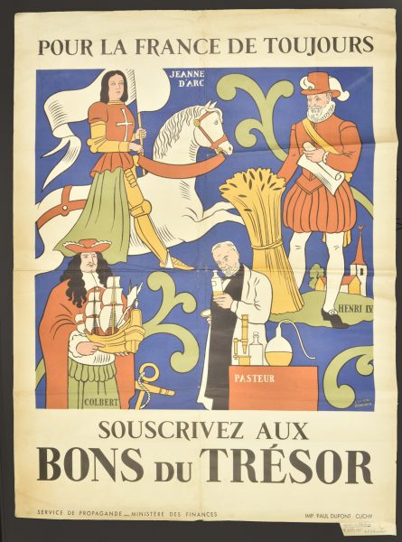 Affiche Jeanne d’Arc. En papier. Dessin en couleur de Lucien Boucher. Dimensions 60 x 80 cm. A noter une certaine usure et patine de la pièce, ainsi que quelques tâches et déchirures. Etat II+.