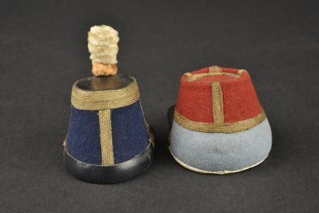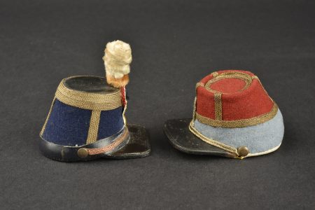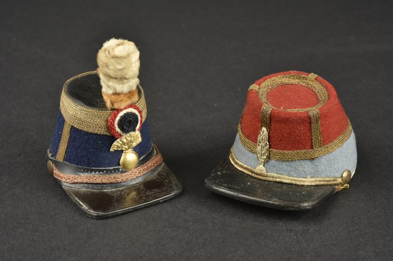 2 miniatures de képis. Une miniature de képi d’infanterie Restauration avec plumet. Une miniature de taconnet d’Afrique Saint-Cyr doublure peau de chamois. Toutes deux à visières carrées.