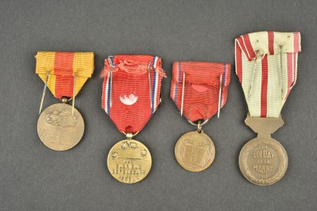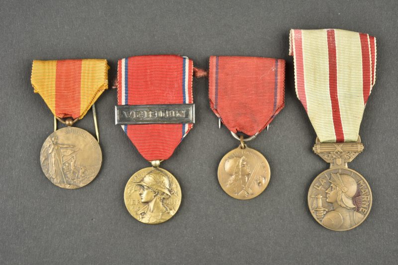 4 médailles françaises 14-18 Verdun, La Marne et Saint Mihiel. Une médaille de Verdun du graveur Vernier, une autre du graveur Prudhomme avec agrafe, une médaille de Saint-Mihiel 1918 et une médaille de combattant de la Marne 1918. Avec leurs rubans.