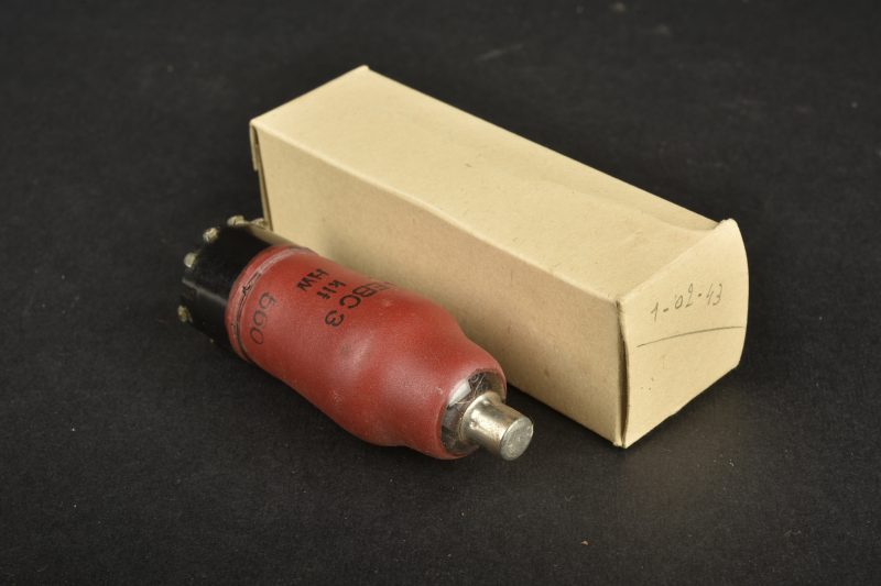 Ampoule allemande. Boite en carton complète, portant le marquage manuscrit 1-02-43. Ampoule complète, marquée EBC 3 KLF HW 560. Bel aigle Waa surmontant la lettre M de la marine, avec marquage Wehrmacht. A noter une certaine usure et patine de la pièce. Etat II+.