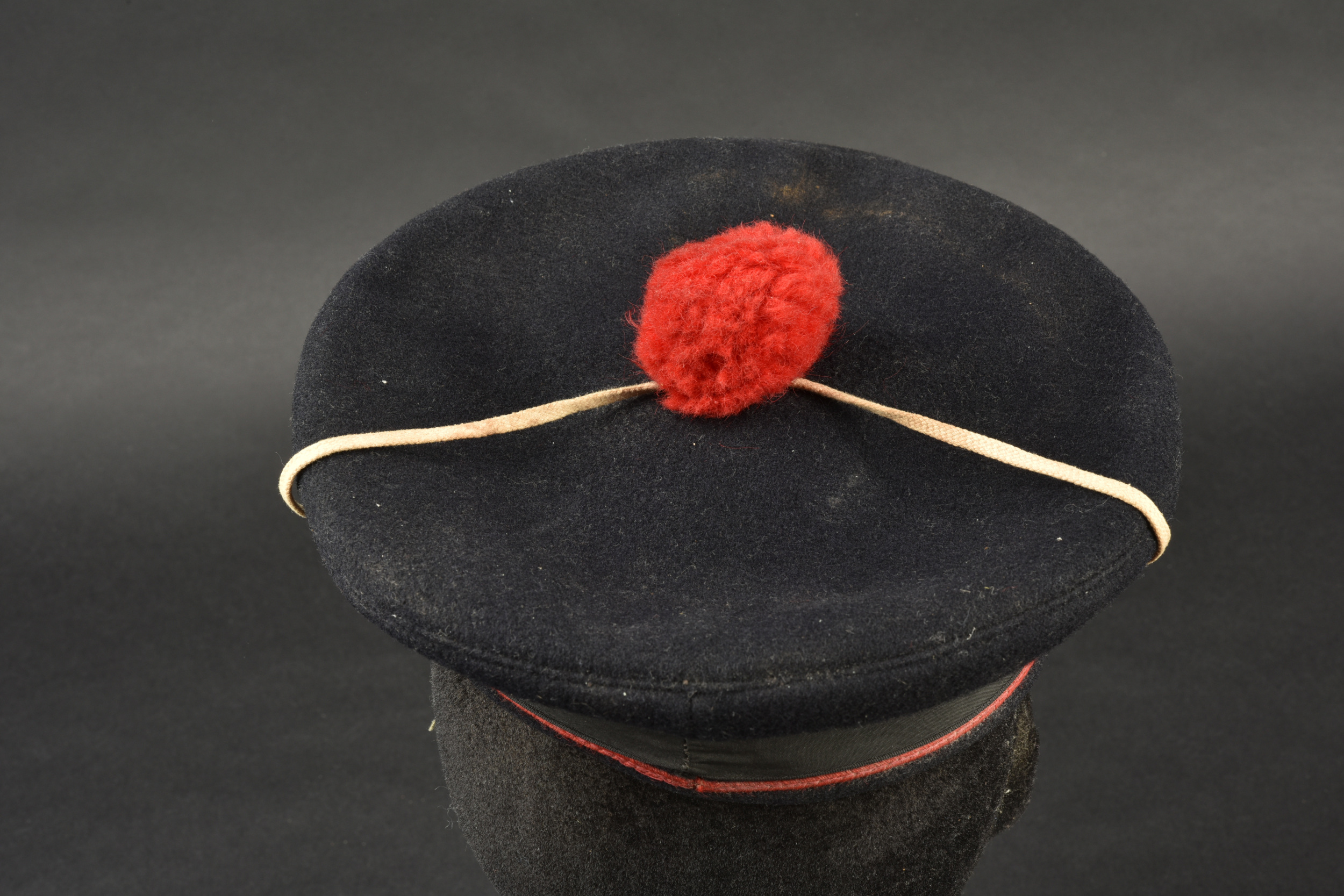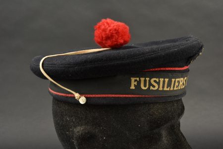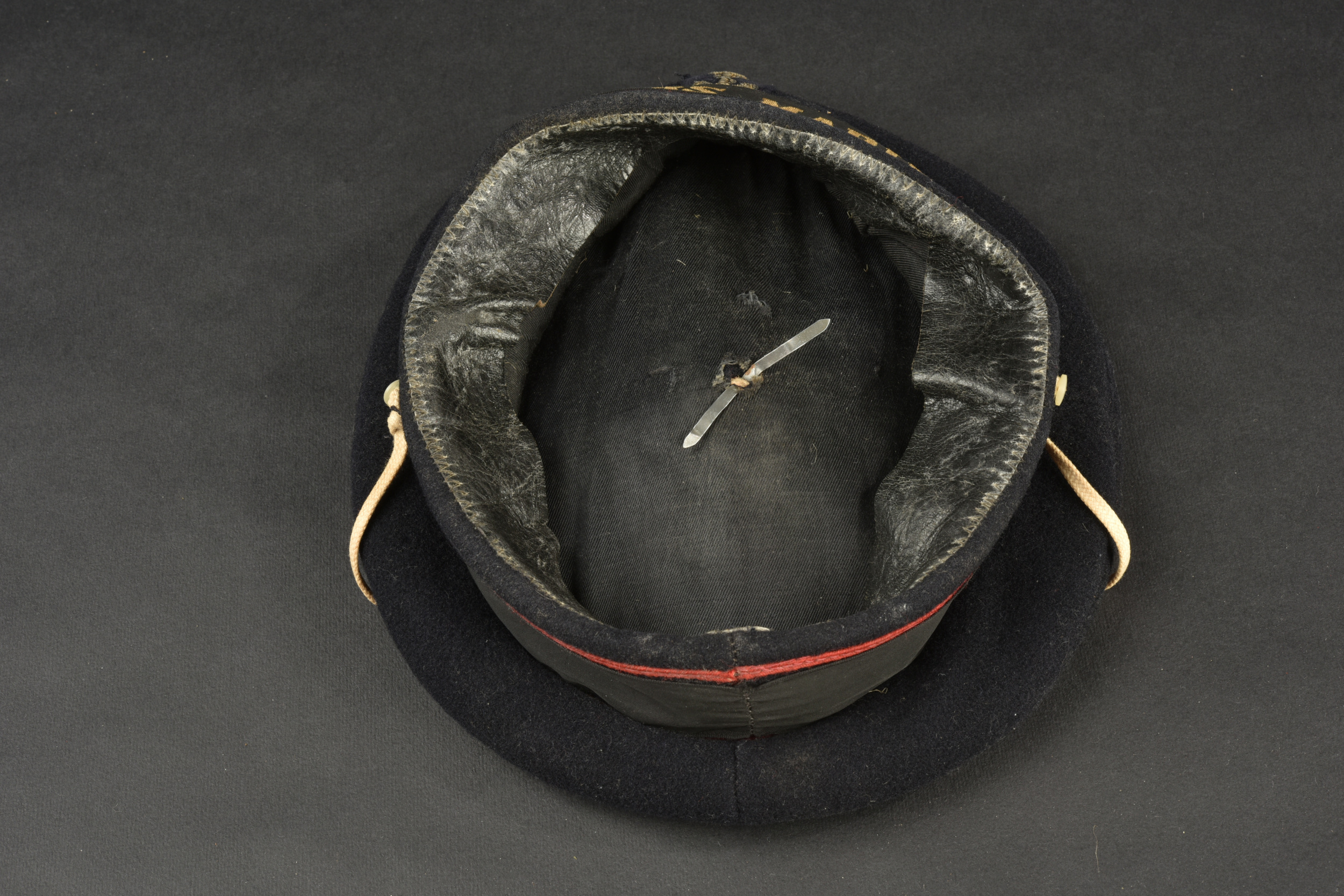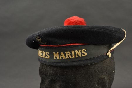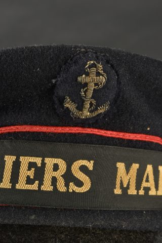 Détails de la vente >Bâchi de la Marine Nationale Française. En drap bleu marine. Ancre de marine en cannetille or sur fond en drap bleu marine. Bandeau marqué Fusiliers marins. Pompon en laine rouge. Intérieur... en savoir plus