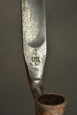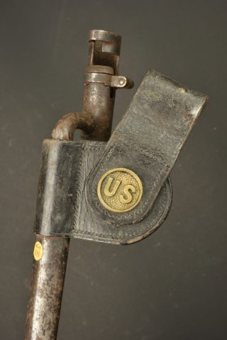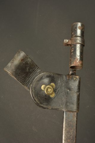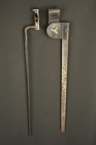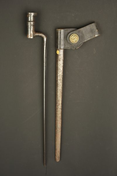 Baïonnette à douille US M1873. Baïonnette à douille pour le fusil Springfield M1873 Trapdoor, lame triangulaire, marquée US. Avec fourreau fer et porte fourreau du 2nd type avec macaron... en savoir plus