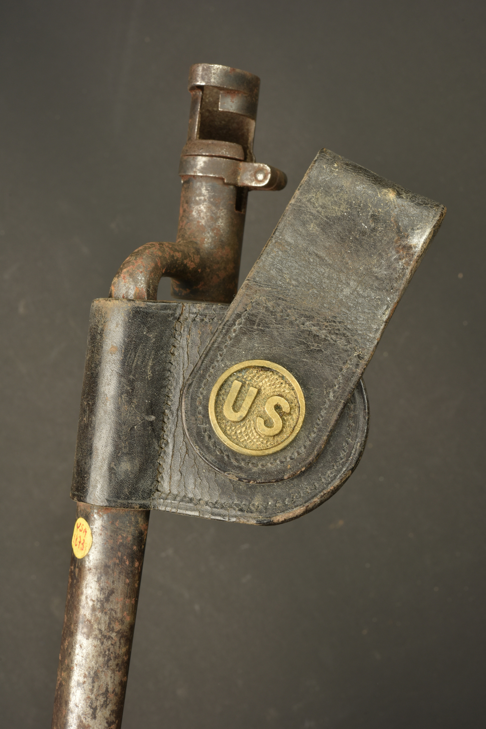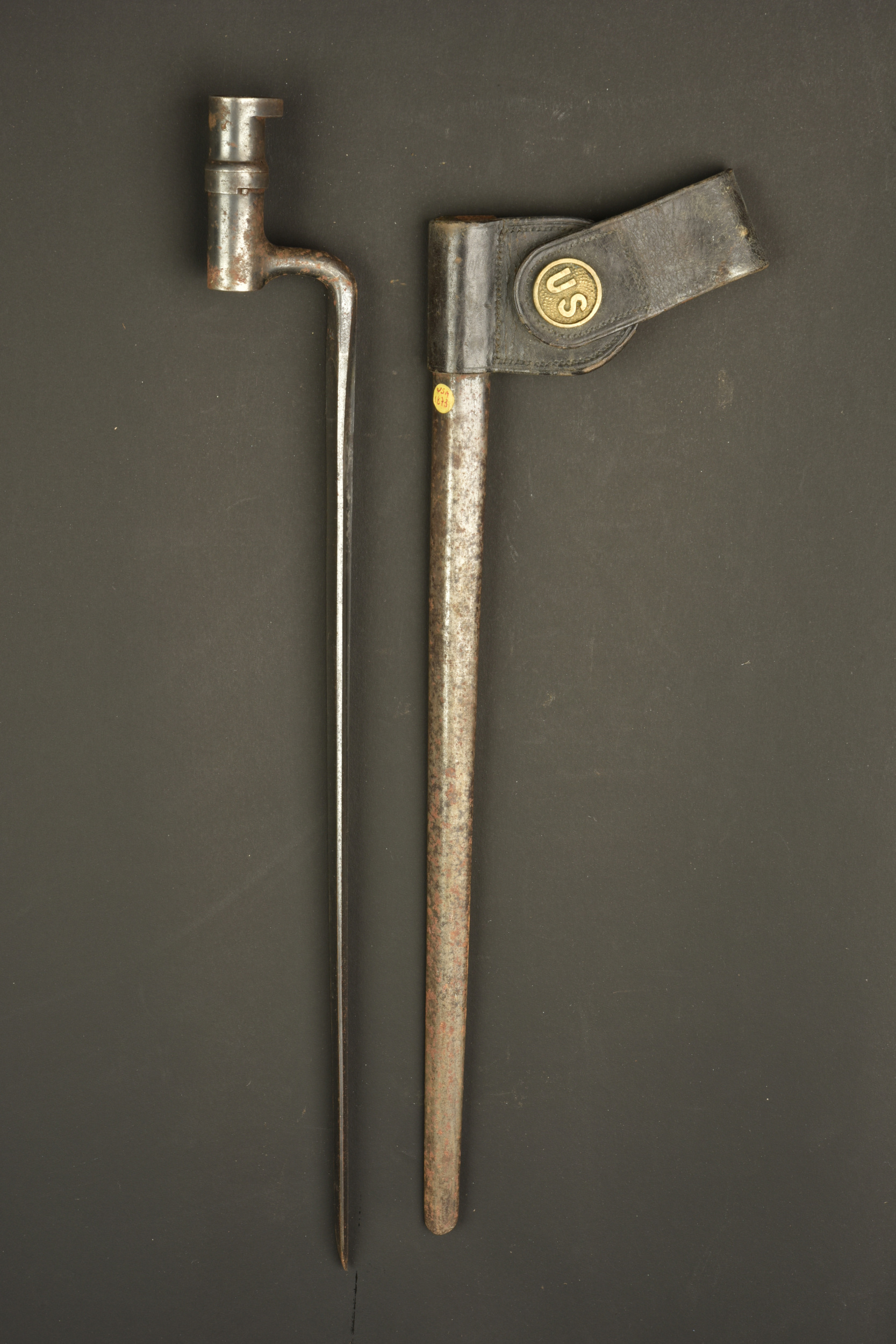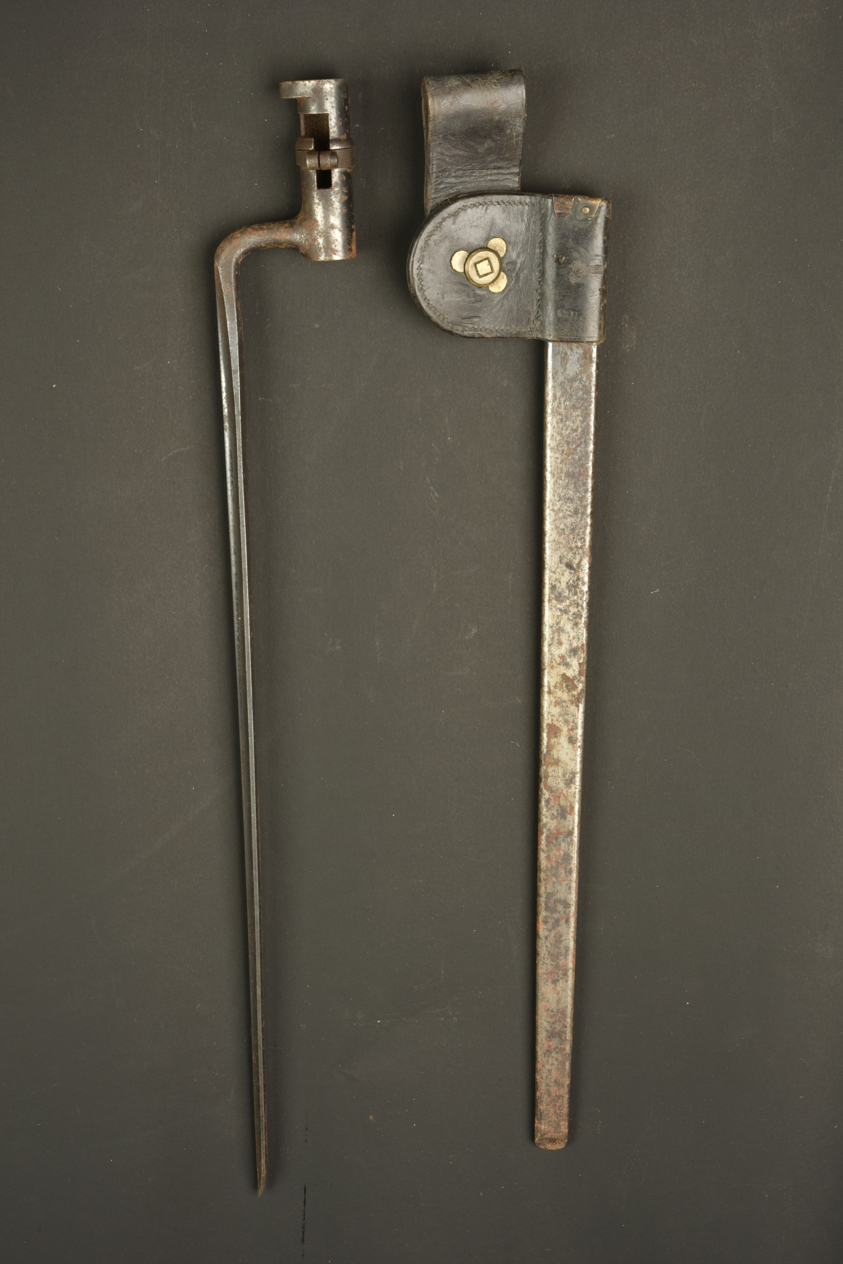 Baïonnette à douille US M1873. Baïonnette à douille pour le fusil Springfield M1873 Trapdoor, lame triangulaire, marquée US. Avec fourreau fer et porte fourreau du 2nd type avec macaron laiton marqué US. Légère oxydation de surface.