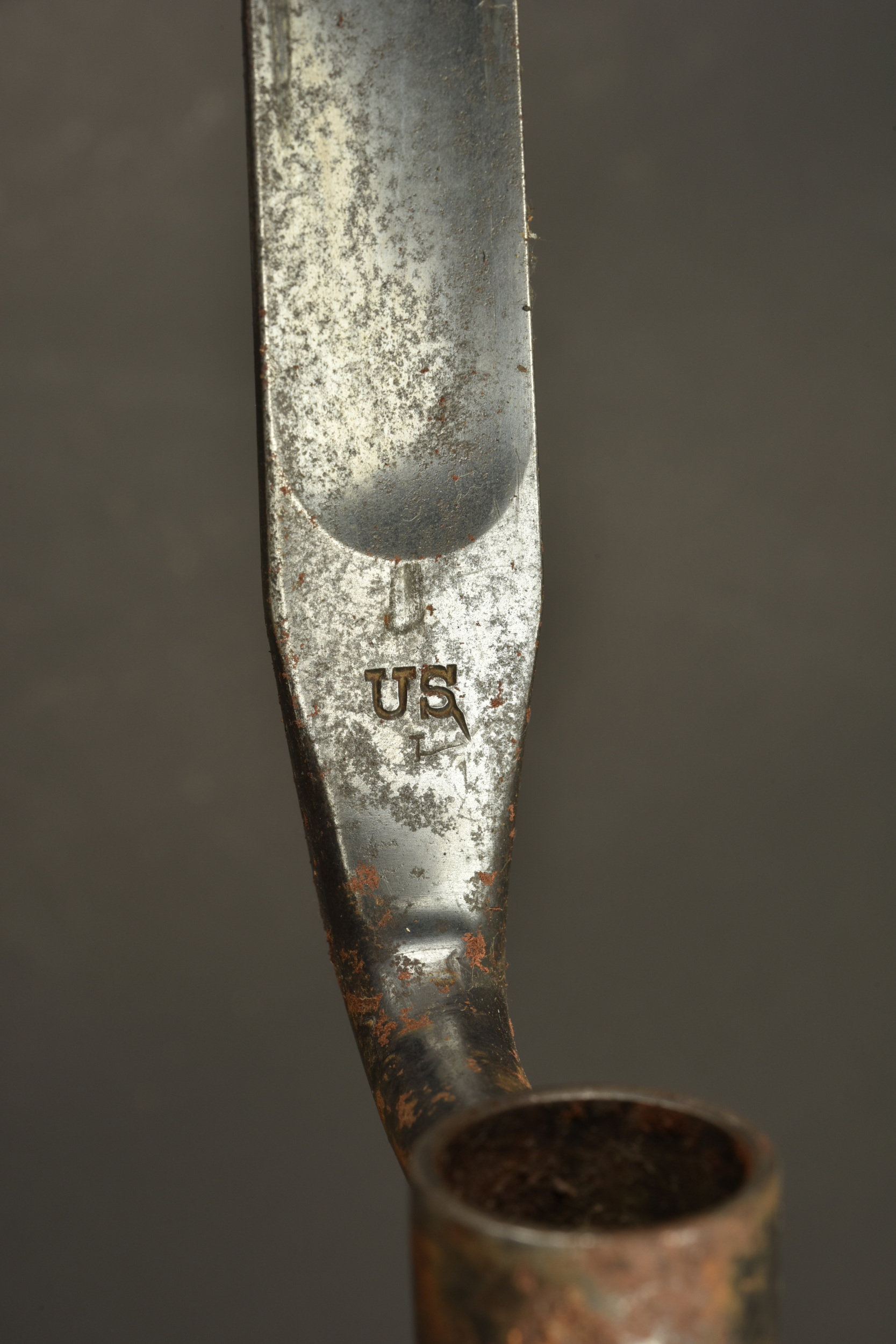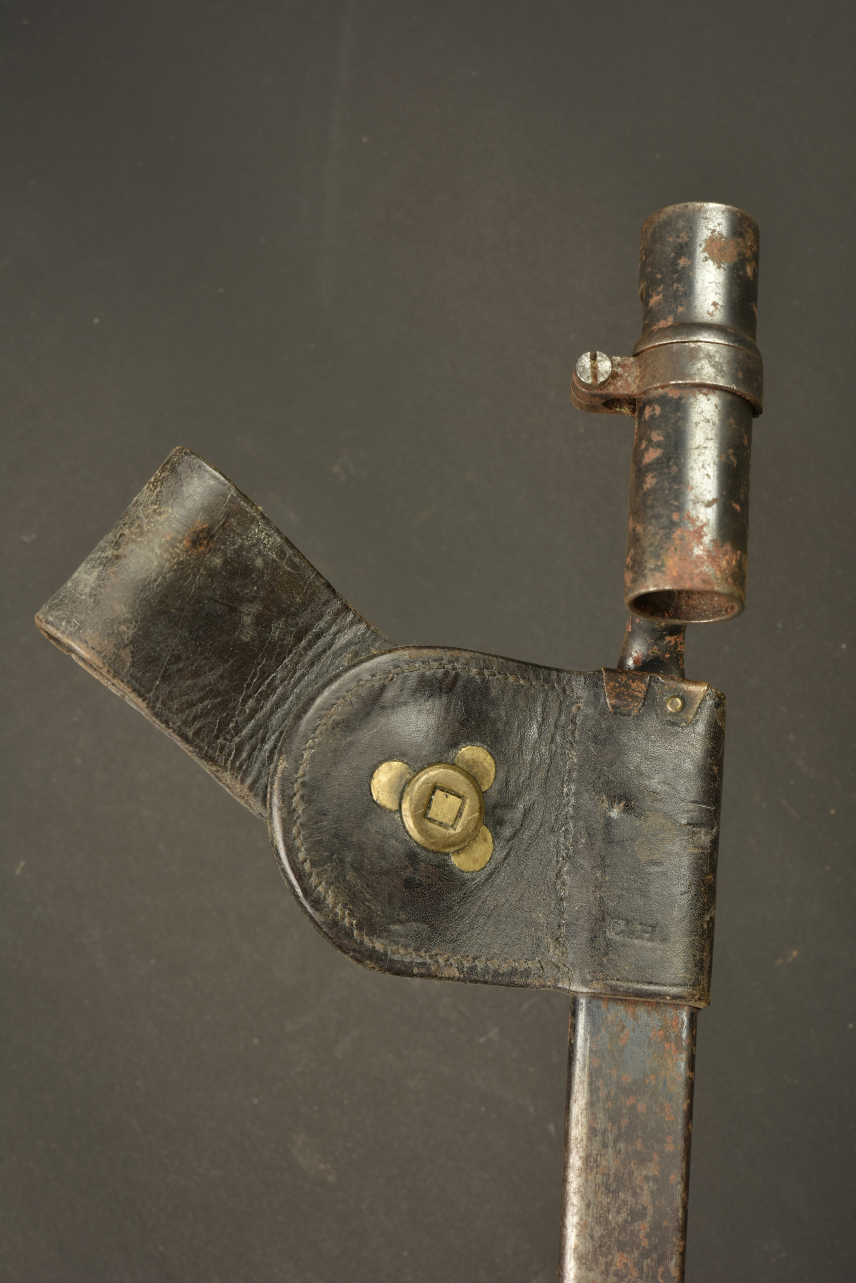 Détails de la vente >Baïonnette à douille US M1873. Baïonnette à douille pour le fusil Springfield M1873 Trapdoor, lame triangulaire, marquée US. Avec fourreau fer et porte fourreau du 2nd type avec macaron... en savoir plus