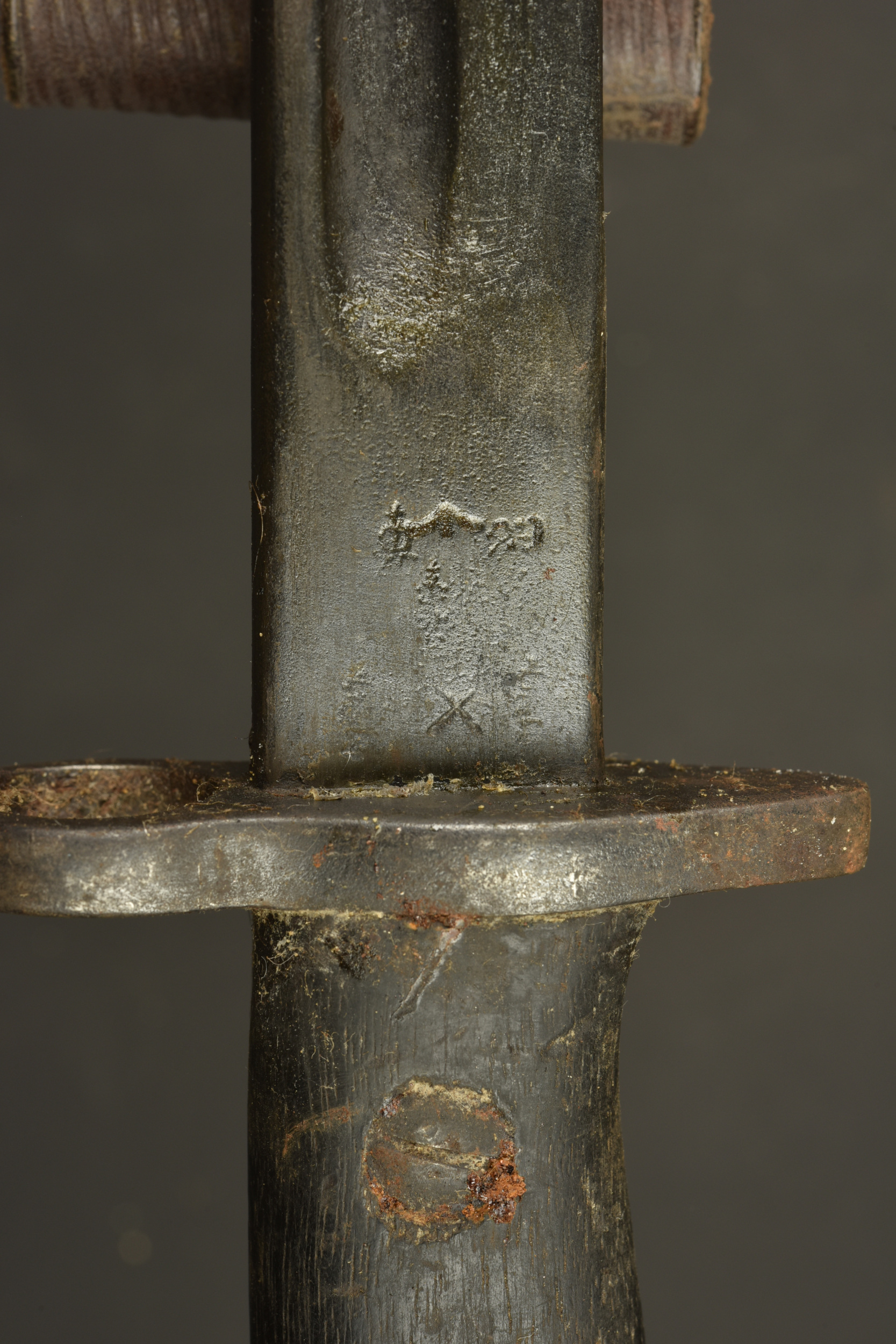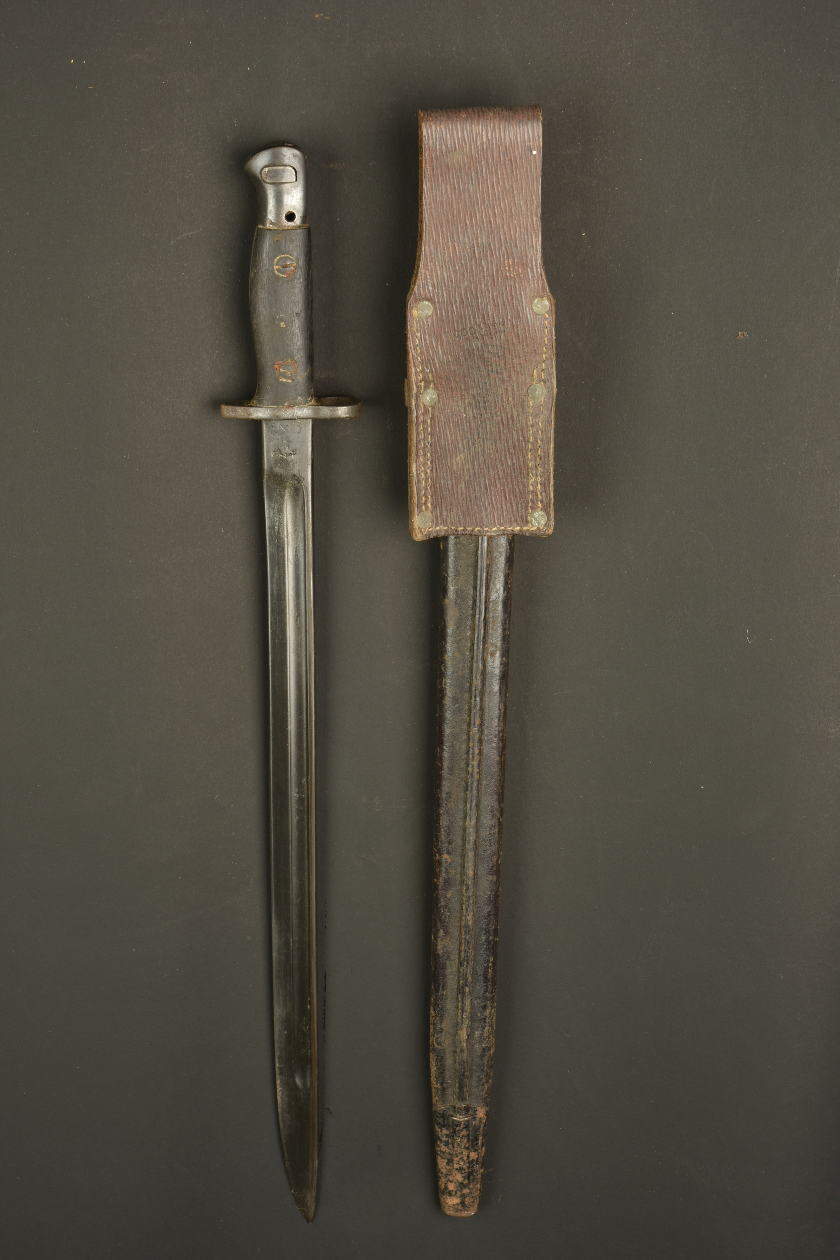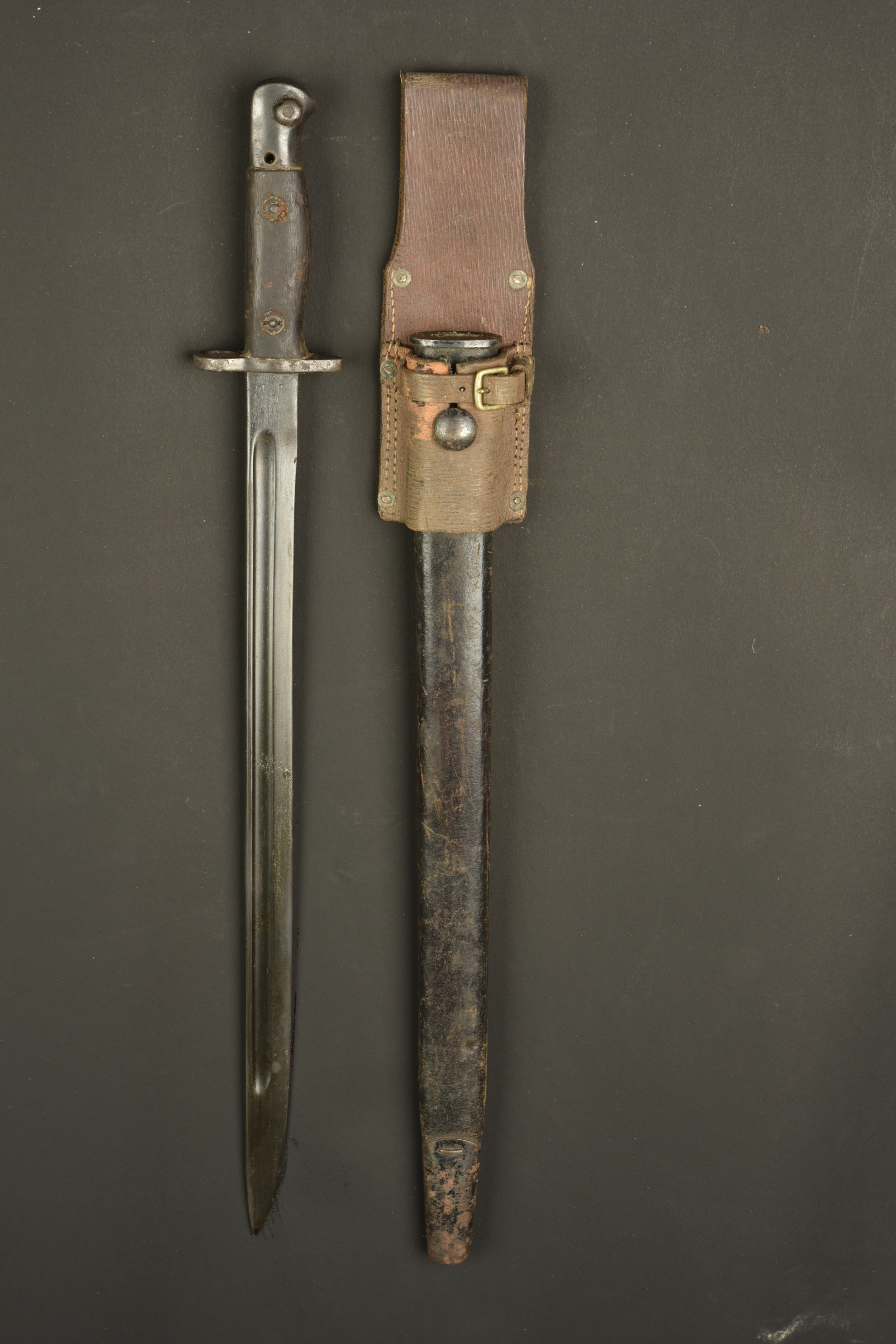 Baïonnette anglaise M 1907 avec porte fourreau cuir. Baïonnette type 1907, lame usée et rebronzée, marquages peu lisible fabricant Sanderson date 1916. Poussoir à débloquer. Fourreau cuir et fer avec bouton de chape rond. Porte fourreau cuir pattern 1914 sans patelette au dos pour personnels autre qu’infanterie. Usure, patine.