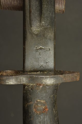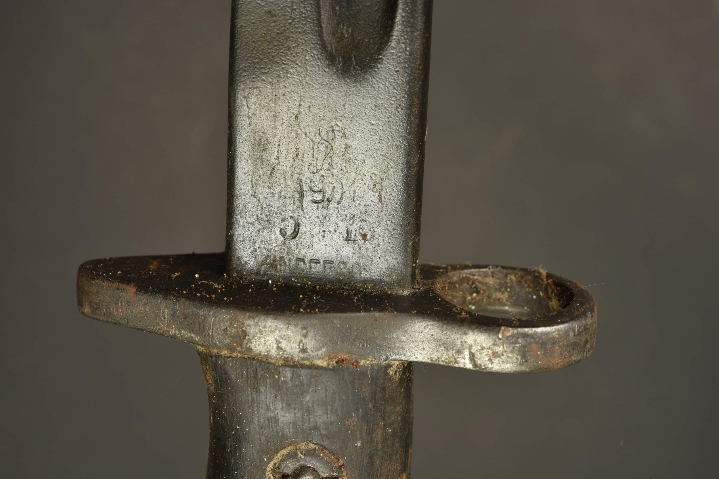 Détails de la vente >Baïonnette anglaise M 1907 avec porte fourreau cuir. Baïonnette type 1907, lame usée et rebronzée, marquages peu lisible fabricant Sanderson date 1916. Poussoir à débloquer. Fourreau cuir et... en savoir plus