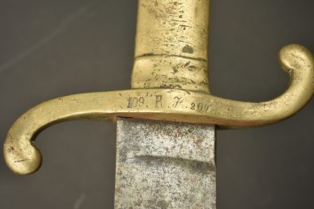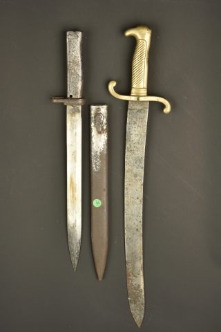 Baîonnette Ersatz et Glaive M1864 du 109e Badois. Baïonnette ersatz en fer, poignée moulée avec son fourreau. Un Faschinenmesser M1864 régimenté 109R, sans fourreau. Corrosion, usure.