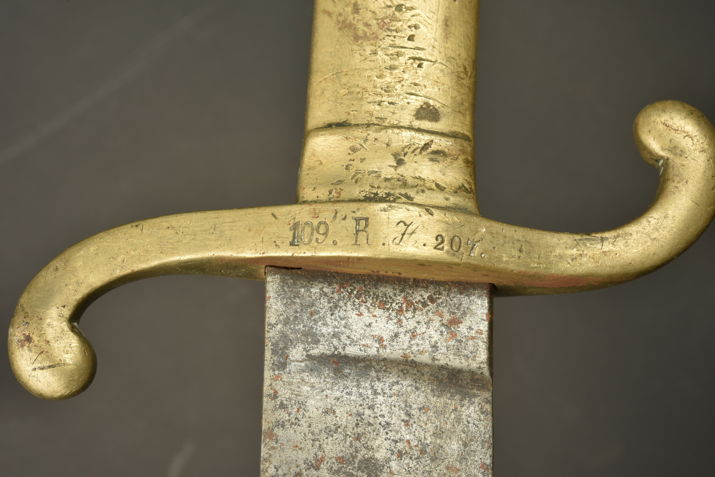 Détails de la vente >Baîonnette Ersatz et Glaive M1864 du 109e Badois. Baïonnette ersatz en fer, poignée moulée avec son fourreau. Un Faschinenmesser M1864 régimenté 109R, sans fourreau. Corrosion, usure.