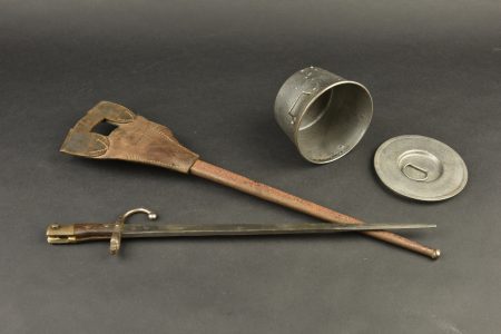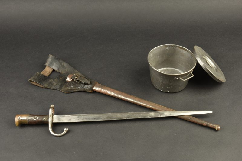 Baïonnette Gras 1874 et Gamelle 1852 Scolaires. Baïonnette Gras 1874 scolaire, bouton poussoir fonctionnel. Fourreau oxydé. Avec son porte fourreau en cuir, inscription au dos « Gras Scolaire » au stylo. Avec une gamelle modèle 1852 pour enfant composée de son bol et de son couvercle. Bon état