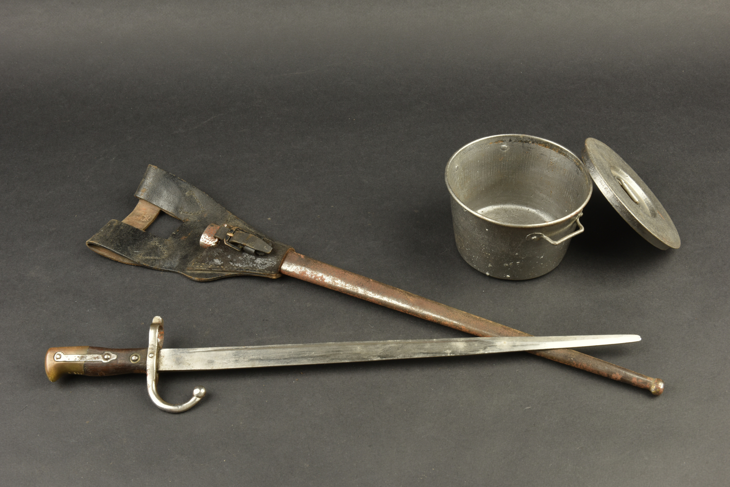 Baïonnette Gras 1874 et Gamelle 1852 Scolaires. Baïonnette Gras 1874 scolaire, bouton poussoir fonctionnel. Fourreau oxydé. Avec son porte fourreau en cuir, inscription au dos « Gras... en savoir plus