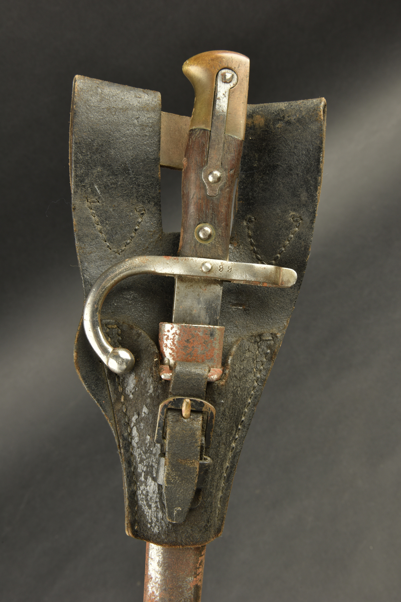 Détails de la vente >Baïonnette Gras 1874 et Gamelle 1852 Scolaires. Baïonnette Gras 1874 scolaire, bouton poussoir fonctionnel. Fourreau oxydé. Avec son porte fourreau en cuir, inscription au dos « Gras... en savoir plus