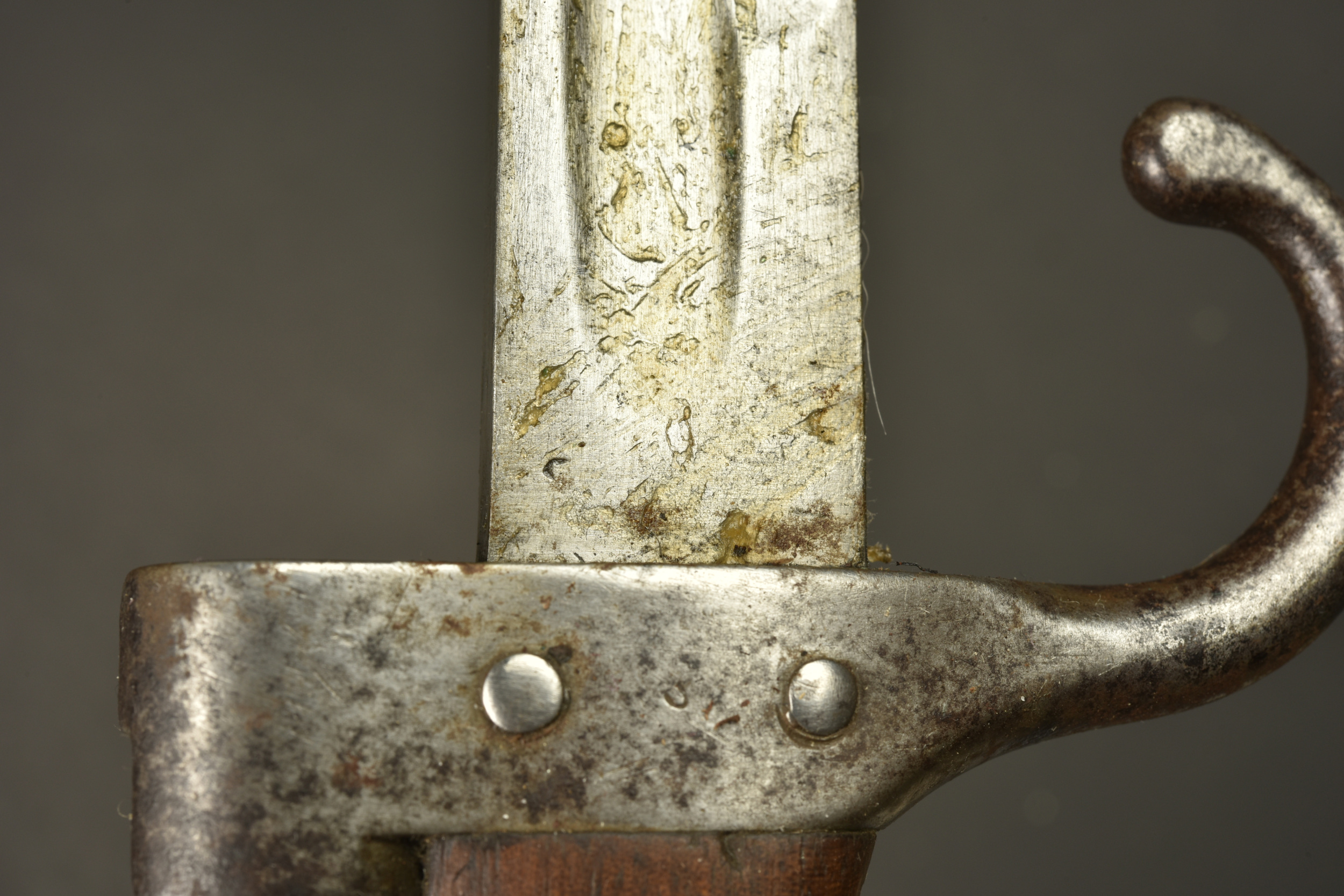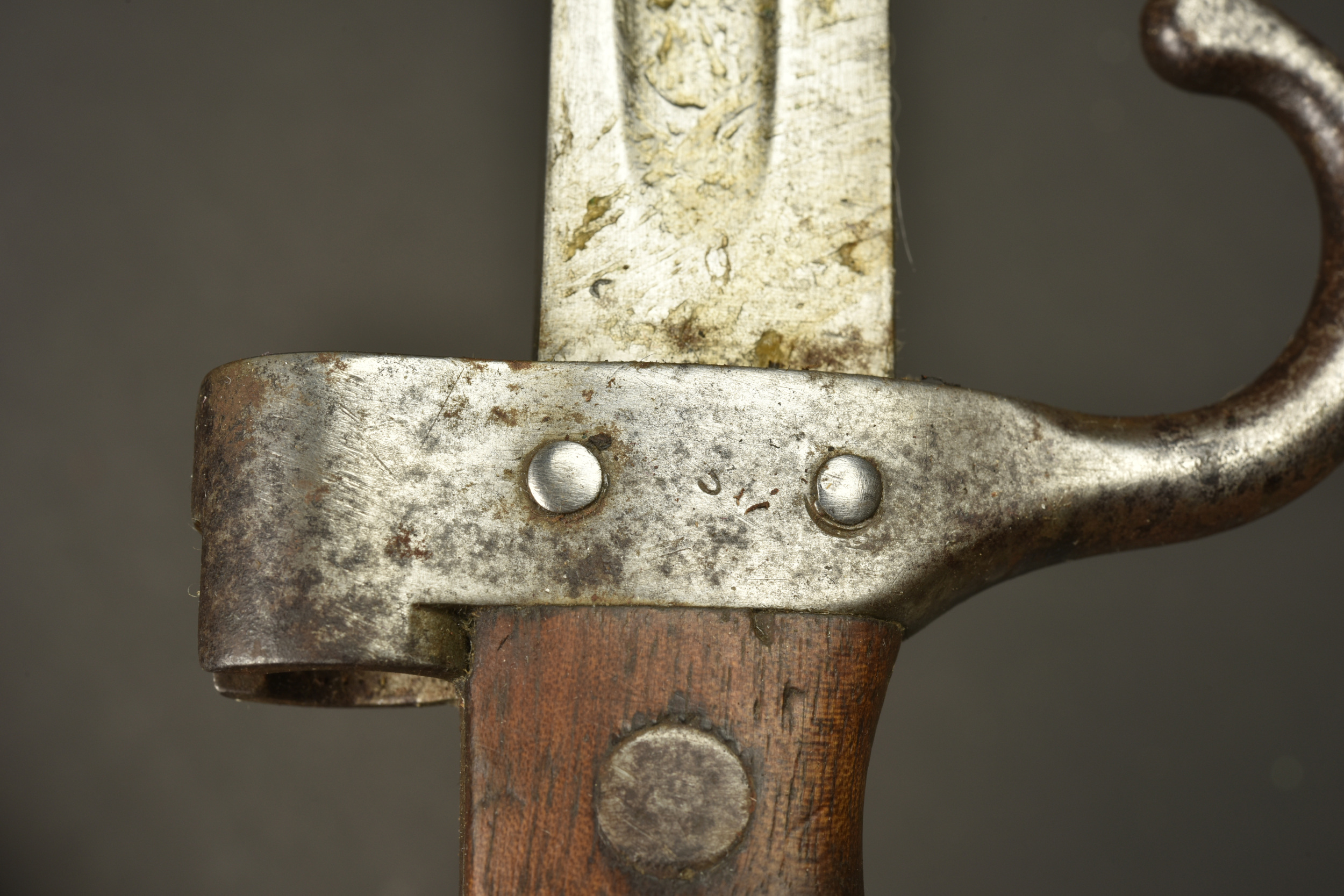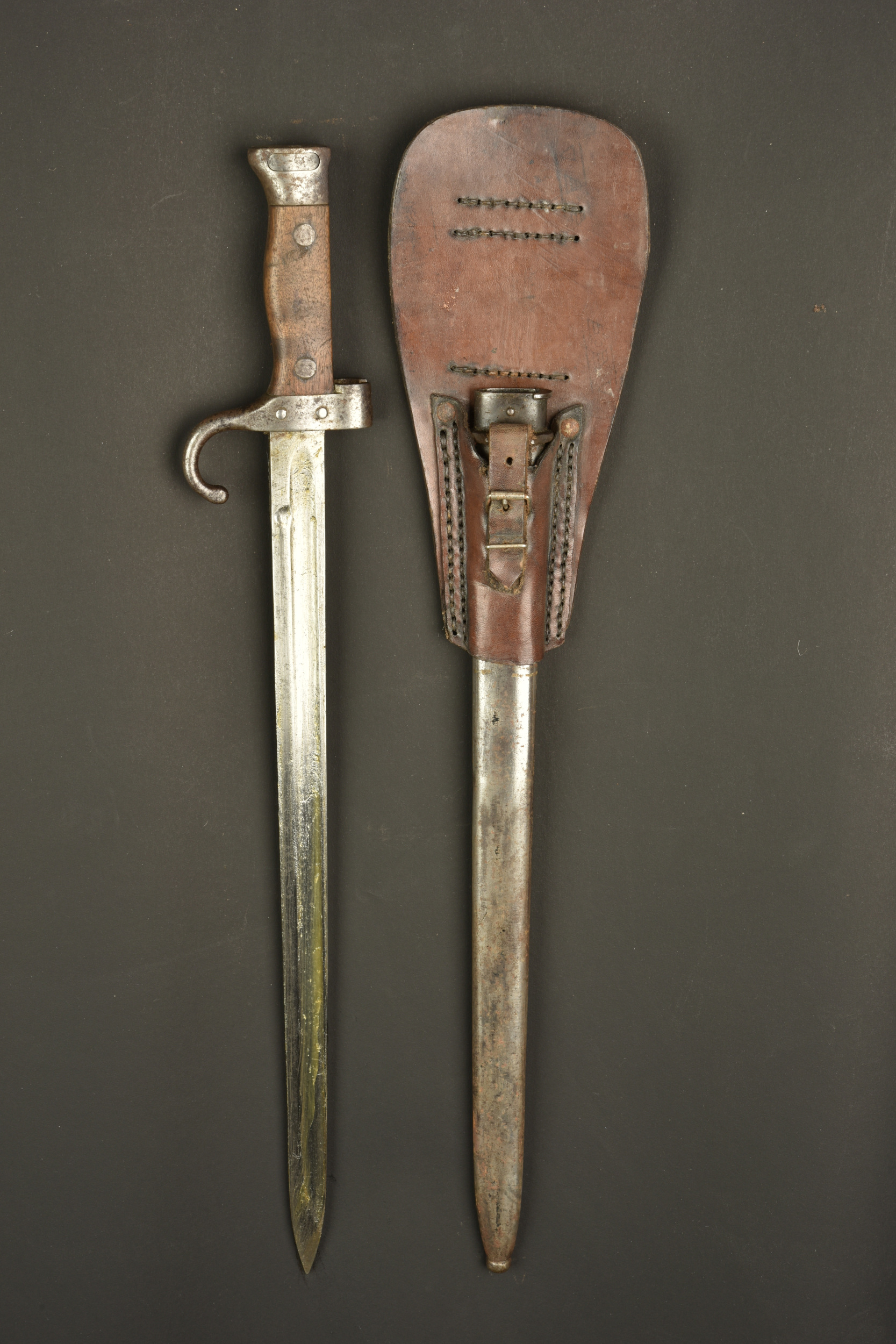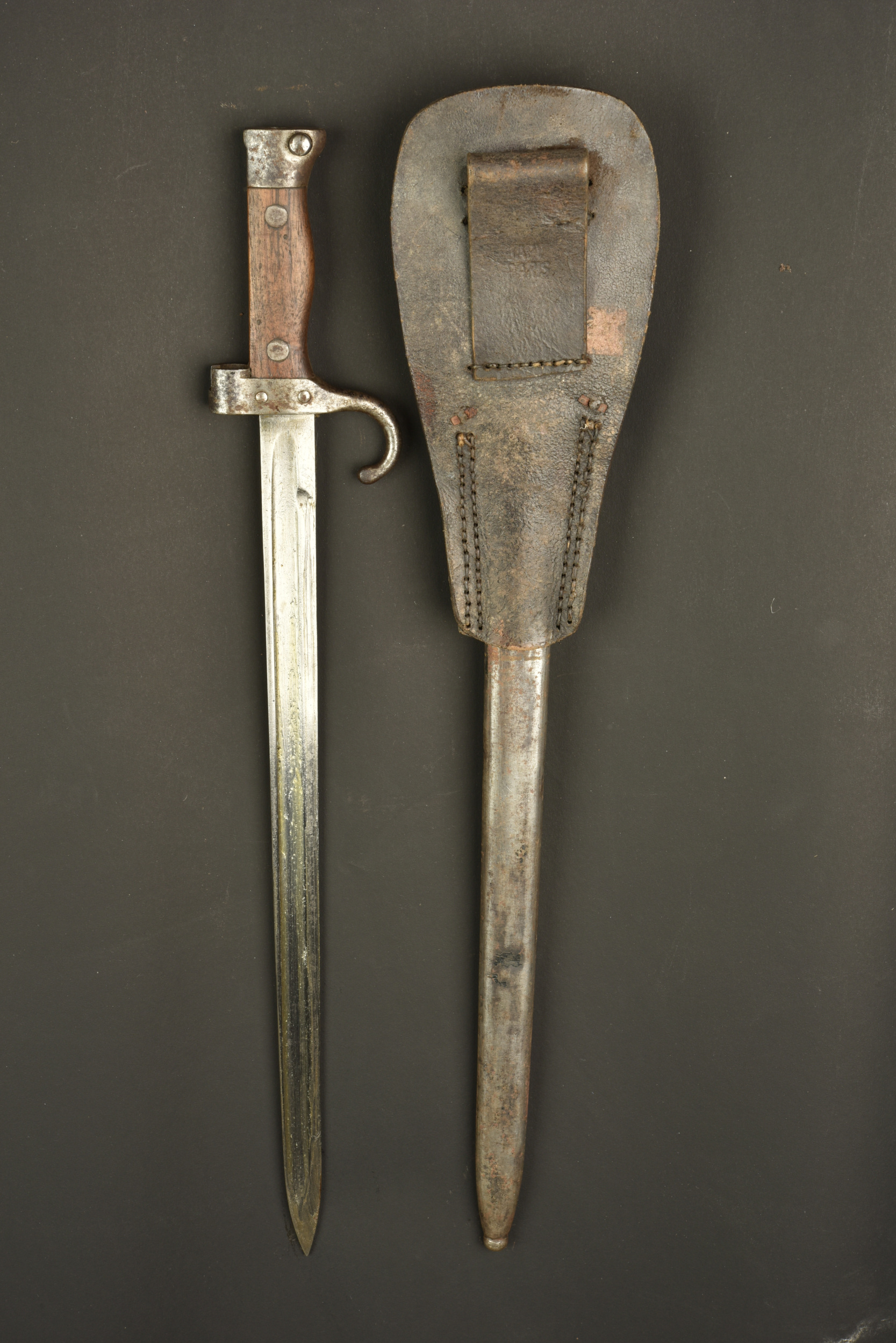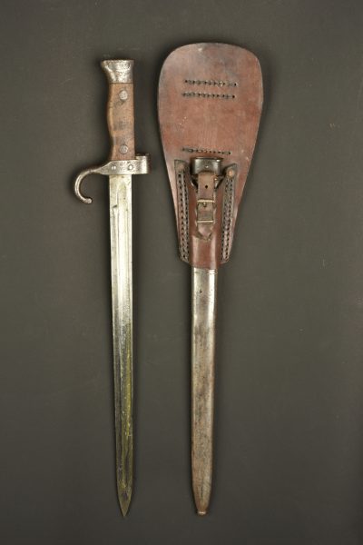 Baïonnette Modèle 1892 Berthier avec porte fourreau Japy. Epée baïonnette modèle 1892 pour mousqueton Berthier. Plaquettes bois. Poussoir fonctionnel. Belle lame à dos plate, non marqué, numéro de série sur le quillon, différent de celui du fourreau. Légère oxydation de surface à nettoyer. Avec un porte fourreau en cuir marron marqué au dos du fabricant JAPY PARIS