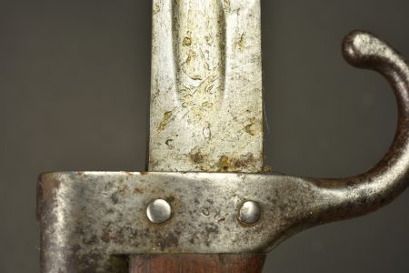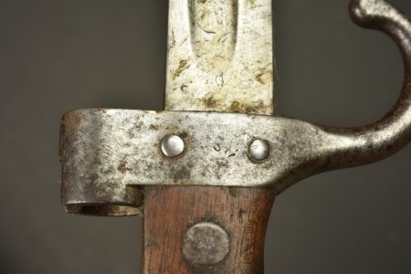 Détails de la vente >Baïonnette Modèle 1892 Berthier avec porte fourreau Japy. Epée baïonnette modèle 1892 pour mousqueton Berthier. Plaquettes bois. Poussoir fonctionnel. Belle lame à dos plate, non marqué,... en savoir plus
