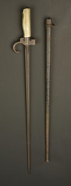 Détails de la vente >Baïonnette Rosalie modèle 1886 à quillon avec impact. Poignée maillechort avec quillon, impact ayant arraché une partie du pommeau. Oxydation. Lame cruciforme, oxydée. Fourreau fer... en savoir plus