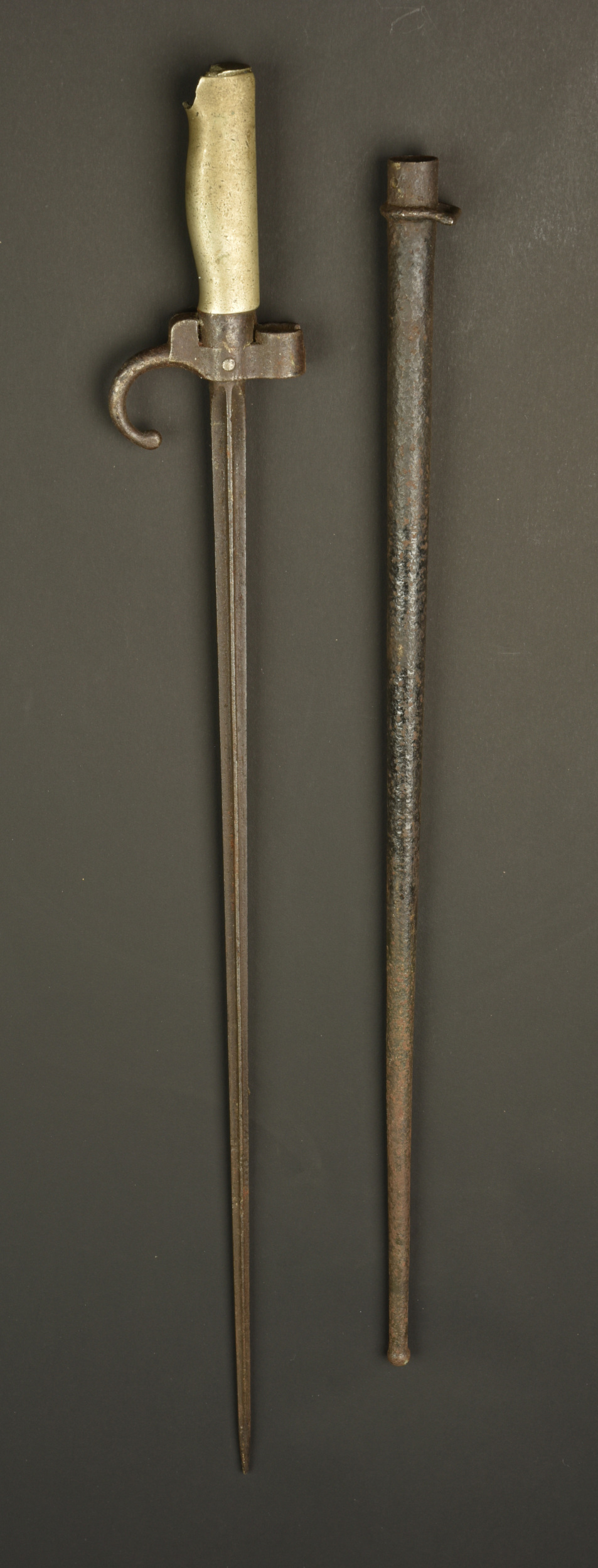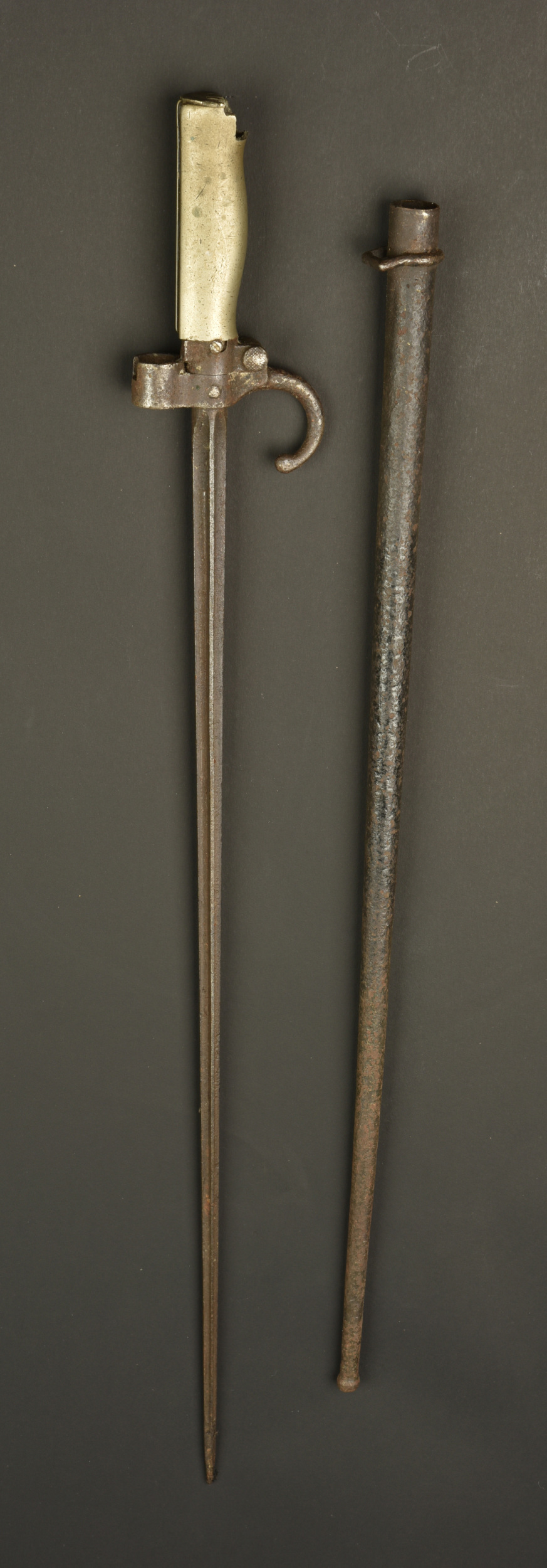 Baïonnette Rosalie modèle 1886 à quillon avec impact. Poignée maillechort avec quillon, impact ayant arraché une partie du pommeau. Oxydation. Lame cruciforme, oxydée. Fourreau fer oxydé