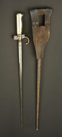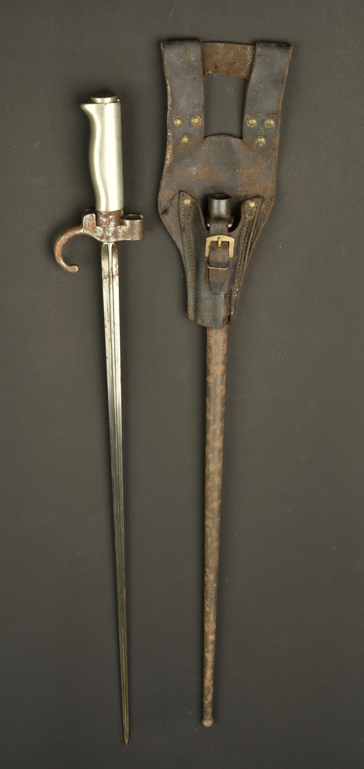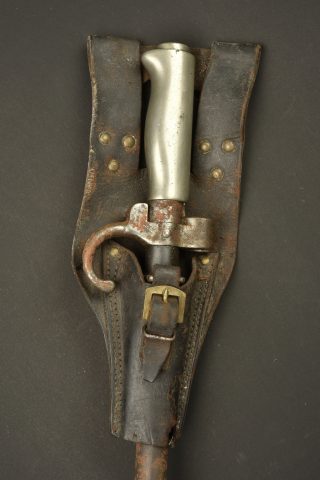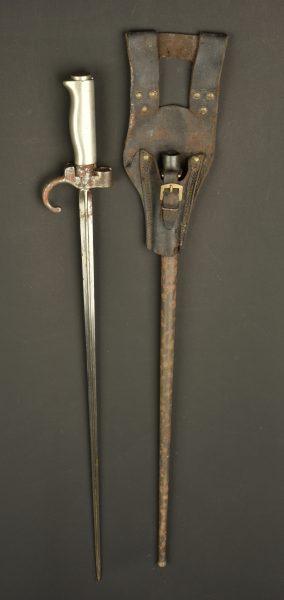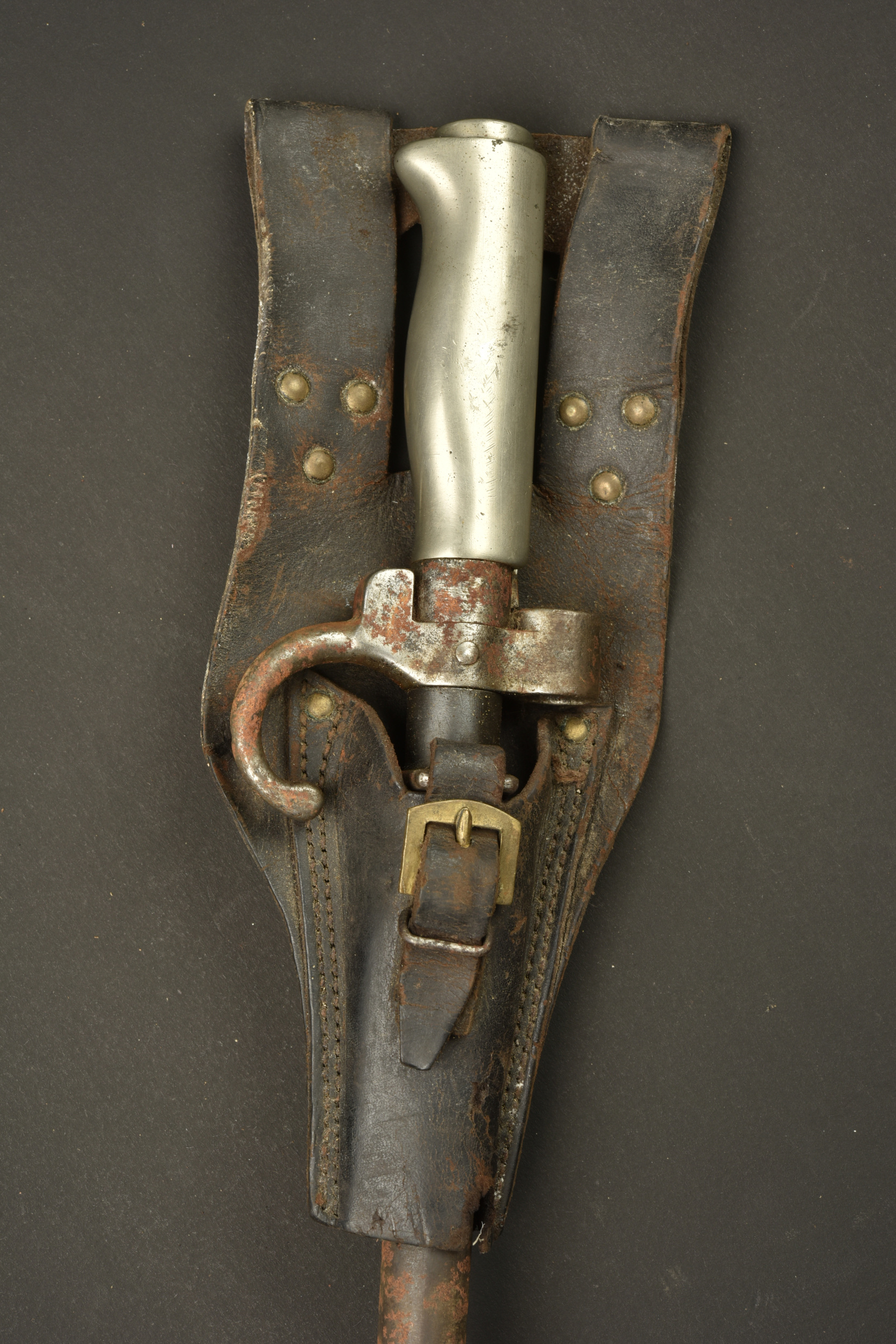 Baïonnette Rosalie modèle 1886 à quillon avec porte fourreau riveté. Poignée maillechort à quillon, poussoir fonctionnel. Lame cruciforme dans sa longueur. Fourreau fer. Porte fourreau en cuir riveté laiton, abimé sur un côté à la sortie du fourreau. Usure, patine, oxydation