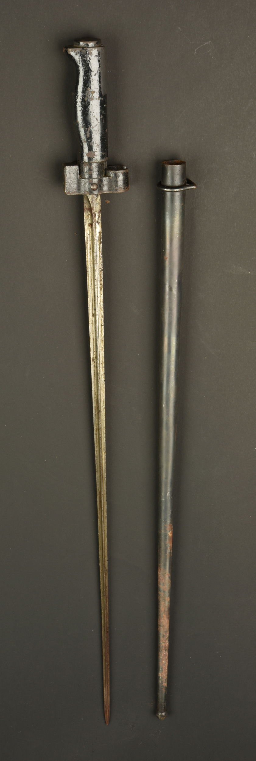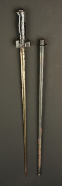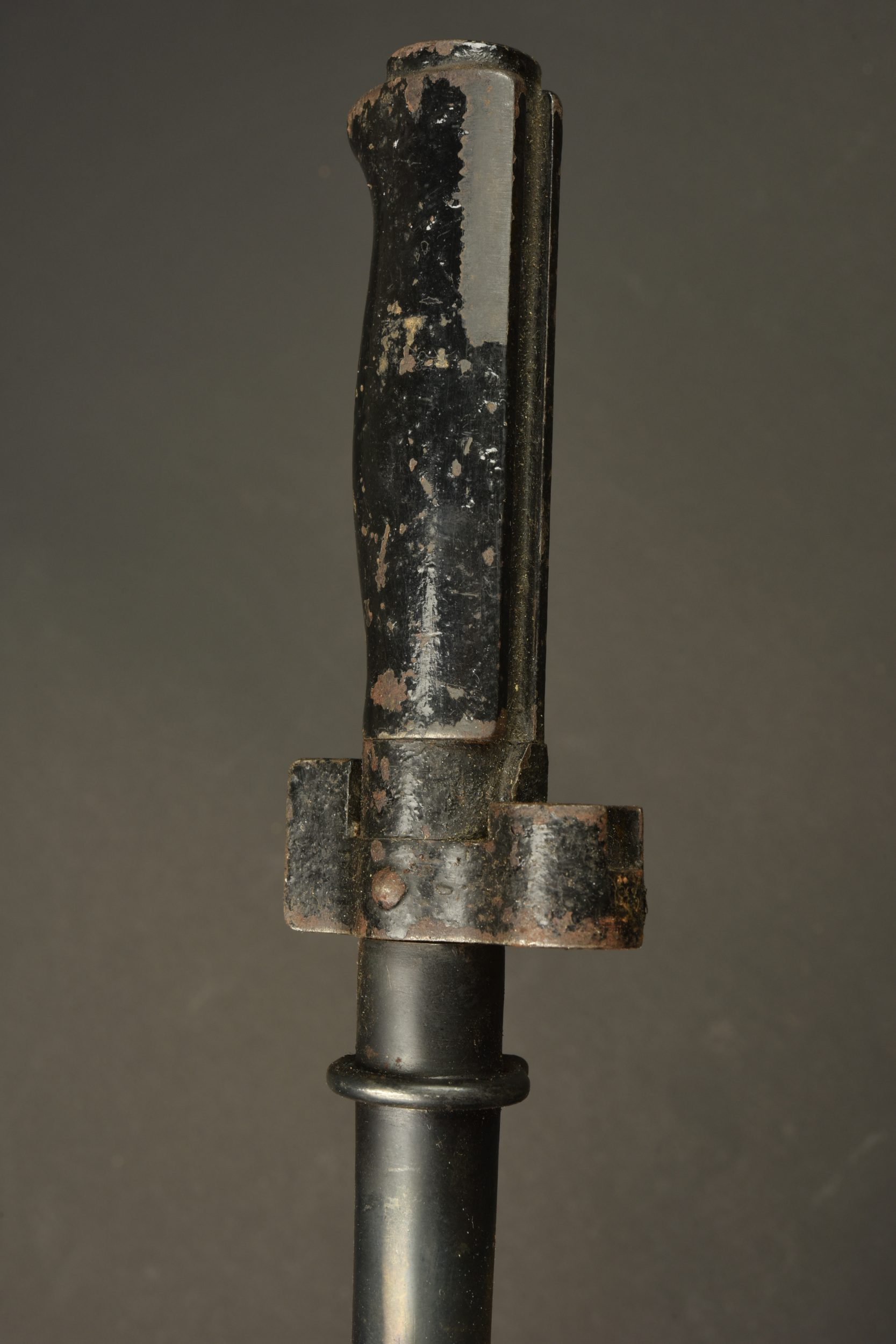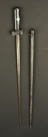 Détails de la vente >Baïonnette Rosalie modèle 1886 poignée fer. Poignée en fer peinte postérieurement en noir. Lame cruciforme. Fourreau fer. Oxydation, usure et patine