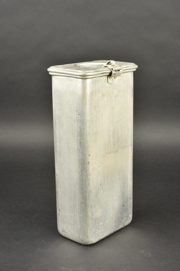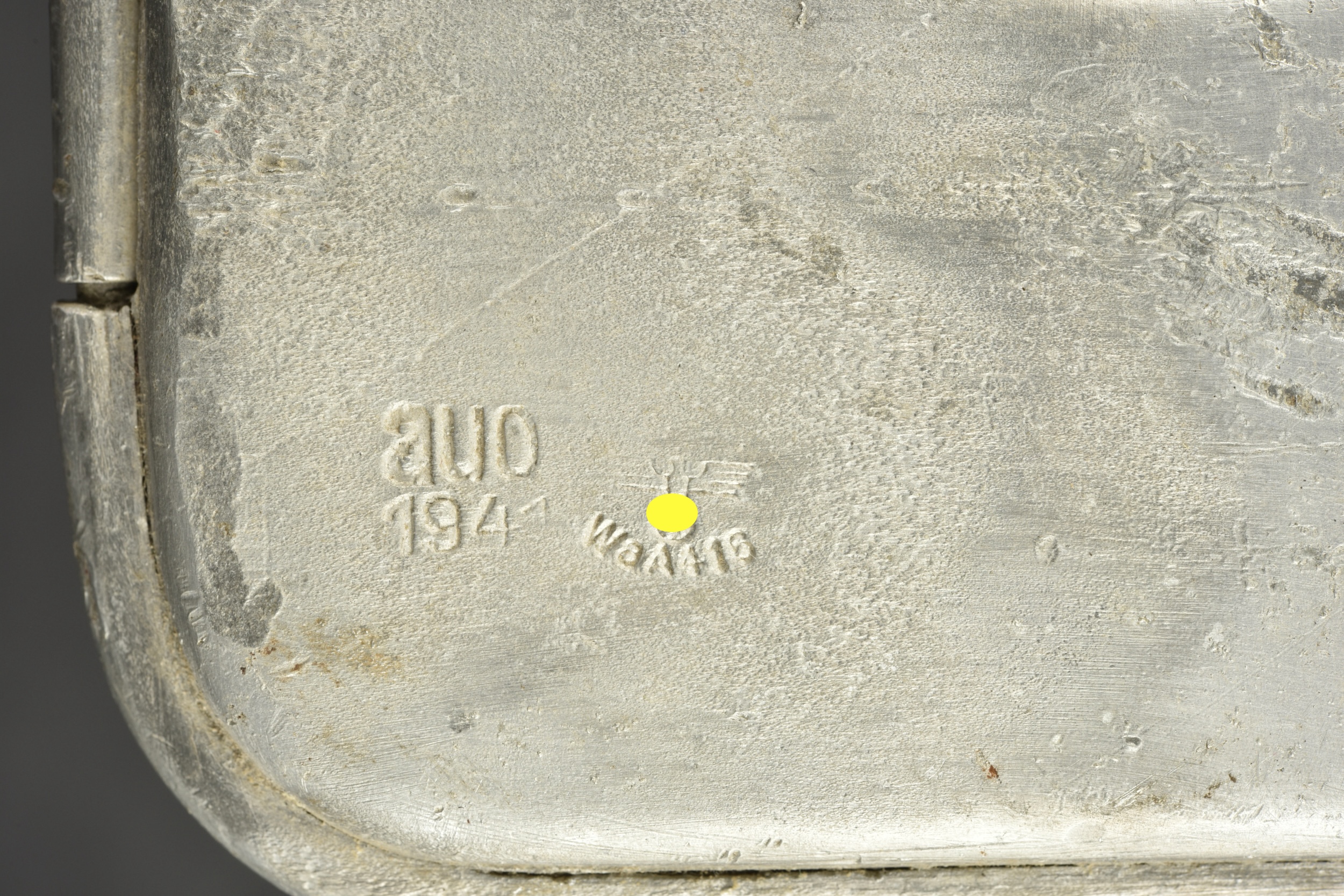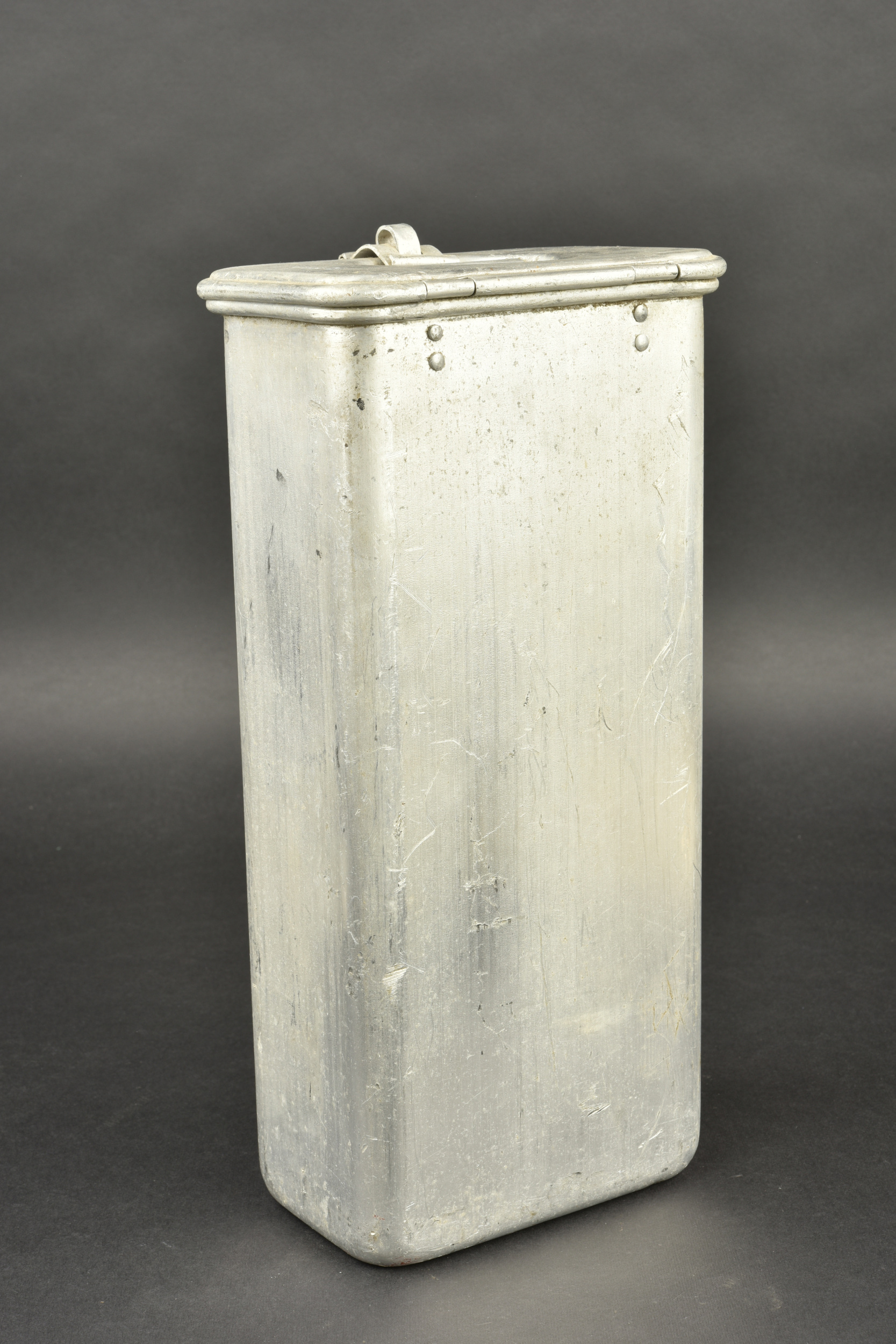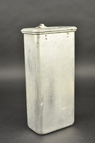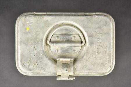Boite de Kaffee pour cuisine Roulante. Modèle en aluminium, complète avec son couvercle. La poignée de transport est présente. Fermeture fonctionnelle. Marquages Kaffee 3 K GR. Fabrication AUO 1941. Vide. A noter une certaine usure et patine de la pièce. Etat II+.