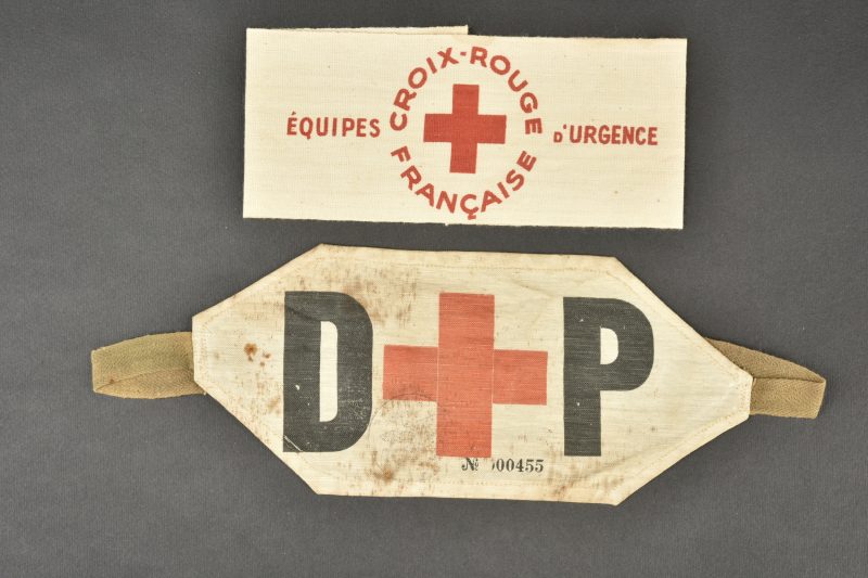 Brassards français. Comprenant un brassard en tissu coton blanc, marquage imprimé DP avec une croix rouge. Numéro 000455, tampon allemand illisible. Attache complète. Un brassard en tissu coton blanc, marquages Equipes D’urgences Croix route Française. A noter une certaine usure et patine des pièces, ainsi que des tâches. Etat II+.