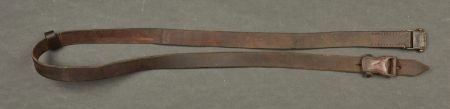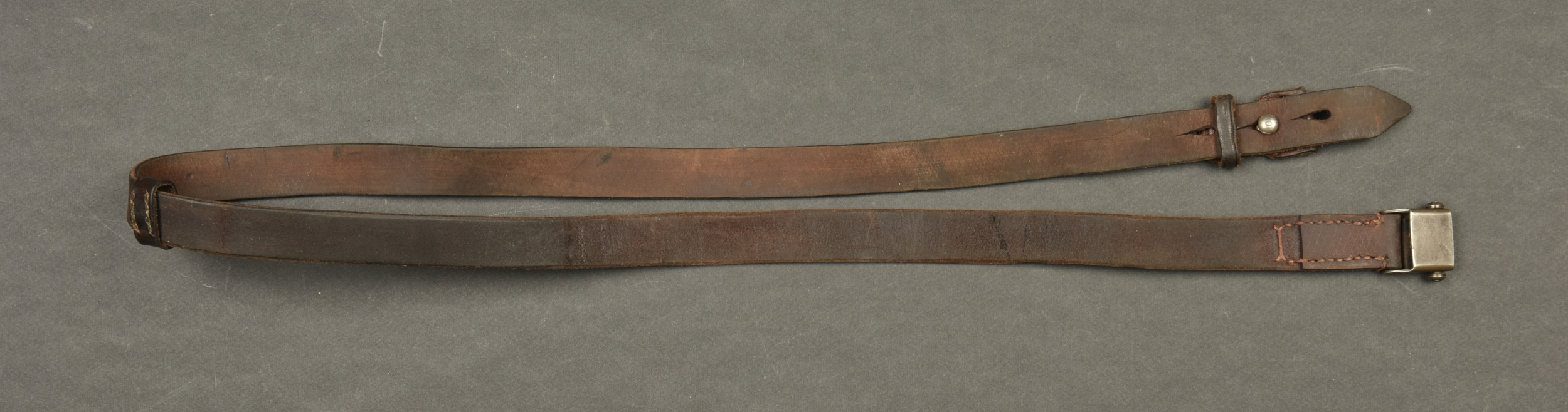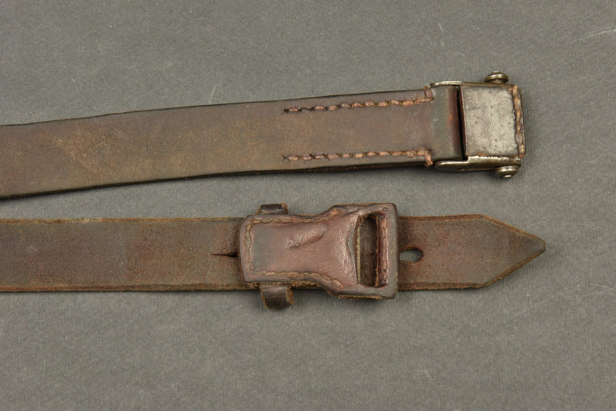 Bretelle de Mauser 98K. En épais cuir marron strié. Trois perforations de réglage. Complète, sans marquages visibles. Coutures refaites. A noter une certaine usure et patine de la pièce. Etat II+.