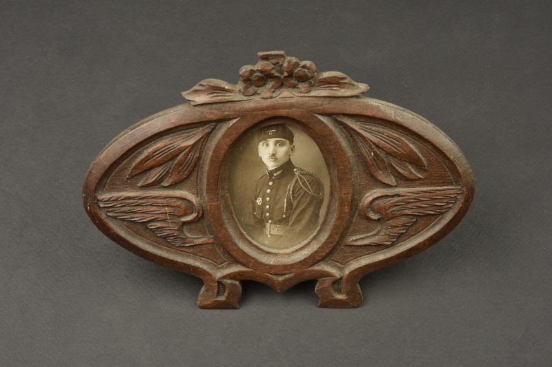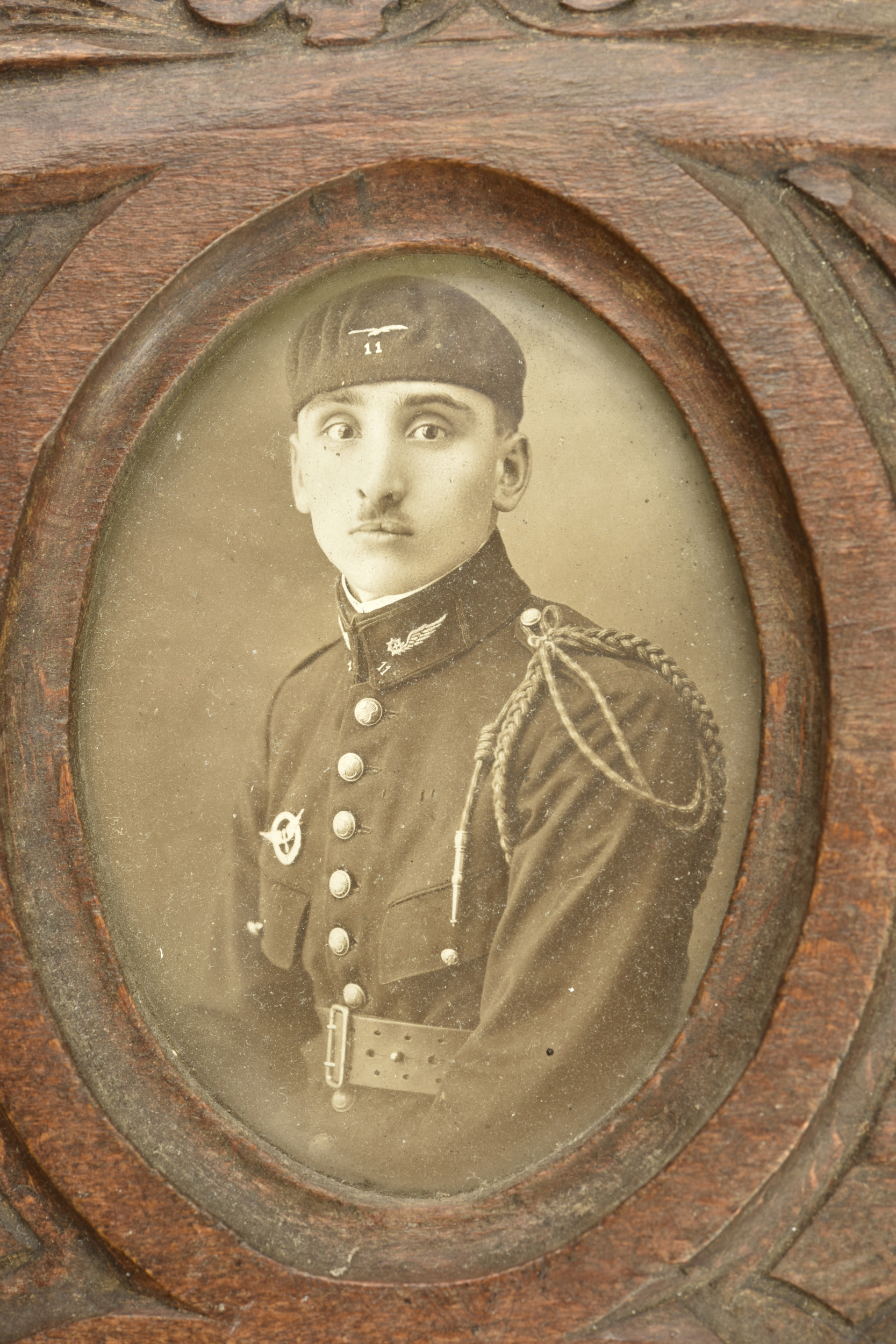 Cadre artisanal avec photo d’un aérostier. Cadre en bois de forme ovale, porte-photo artisanal, gravé de part et d’autre d’ailes, avec décors de feuillage et fleurs en chef. Photo d’un aérostier, portant une tunique noire, son brevet, fourragère Croix de Guerre. Pattes de col roue dentée ailée et chiffre 11, béret avec charognard et chiffre 11. Bon état
