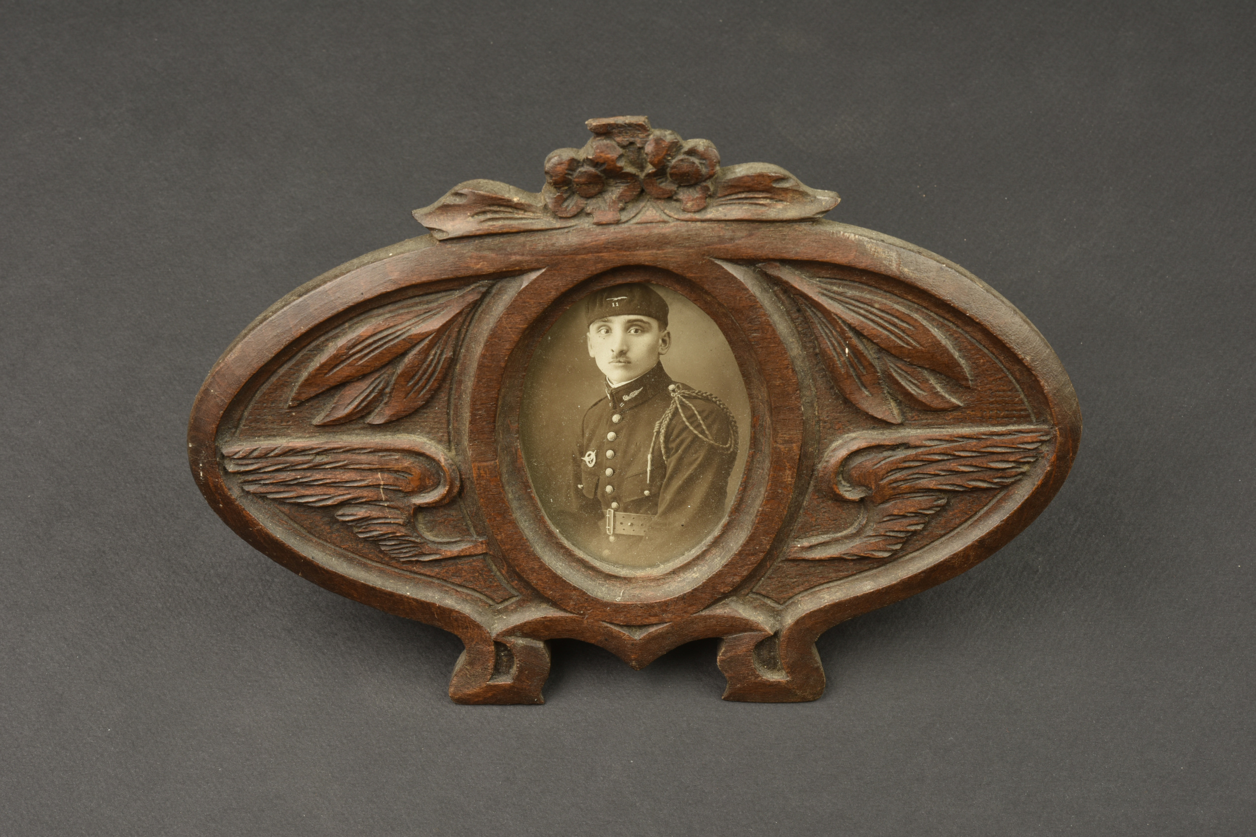 Détails de la vente >Cadre artisanal avec photo d’un aérostier. Cadre en bois de forme ovale, porte-photo artisanal, gravé de part et d’autre d’ailes, avec décors de feuillage et fleurs en chef.... en savoir plus