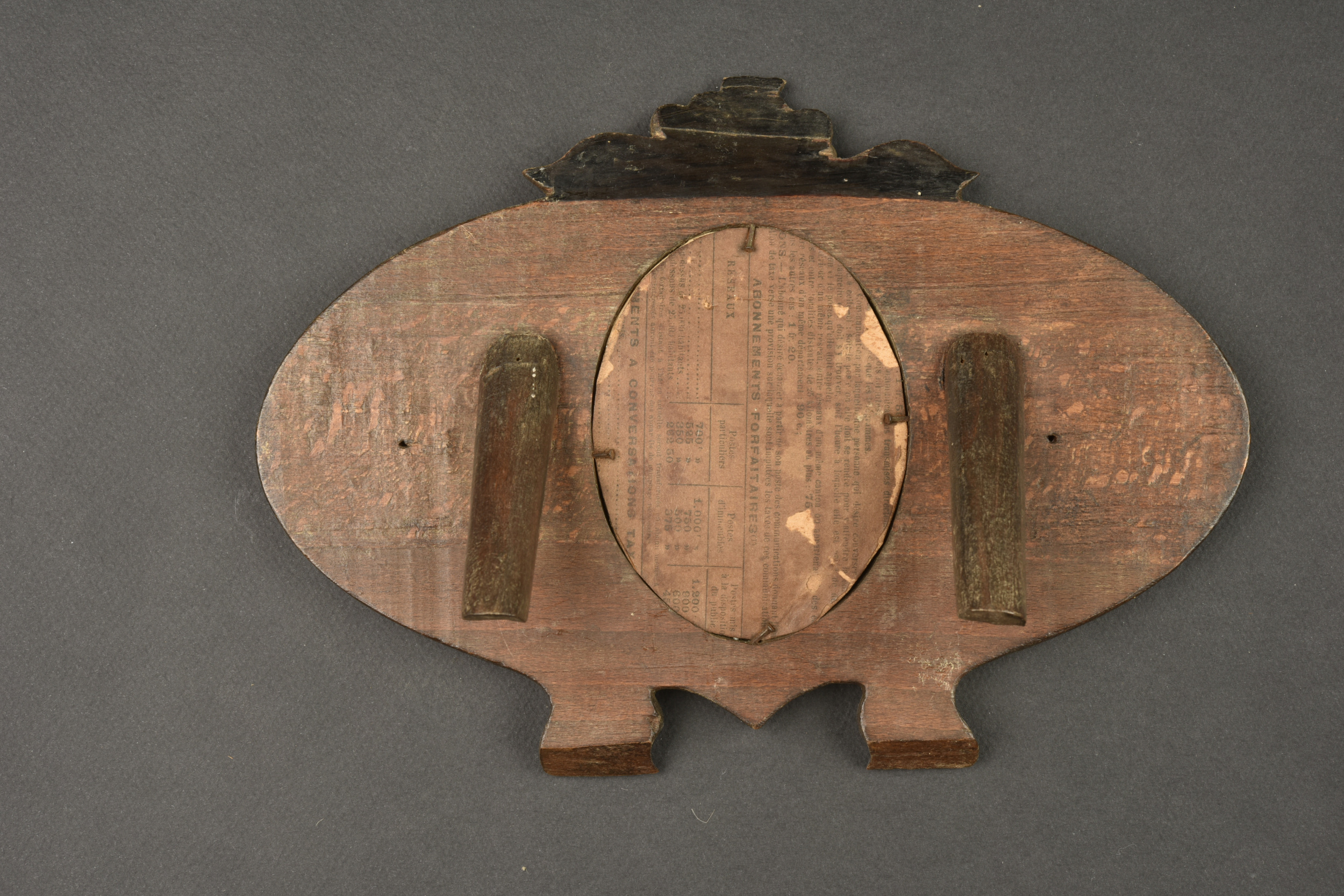Cadre artisanal avec photo d’un aérostier. Cadre en bois de forme ovale, porte-photo artisanal, gravé de part et d’autre d’ailes, avec décors de feuillage et fleurs en chef.... en savoir plus
