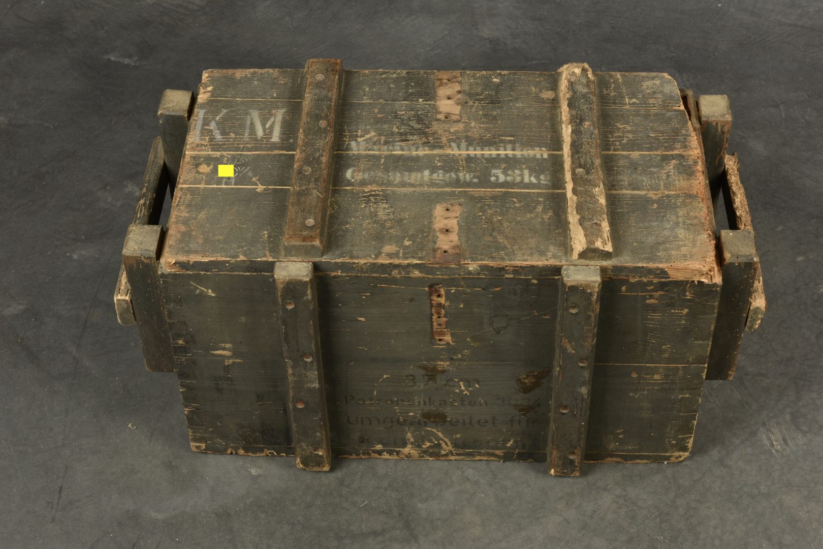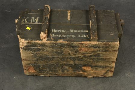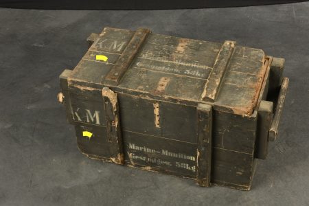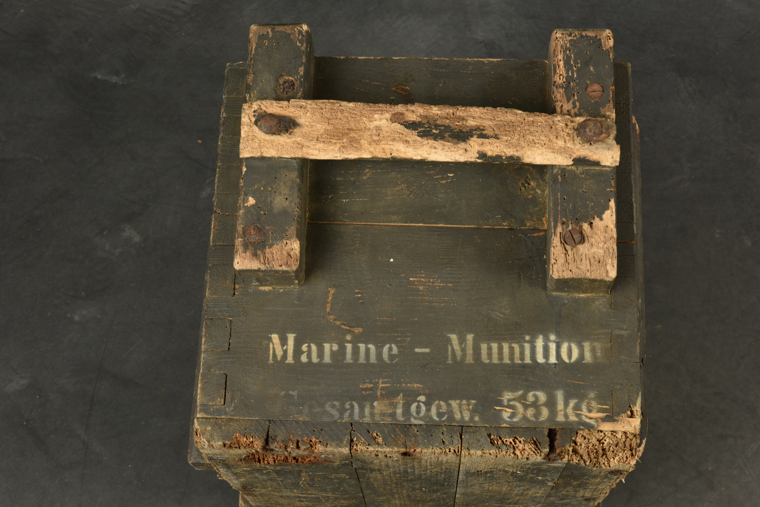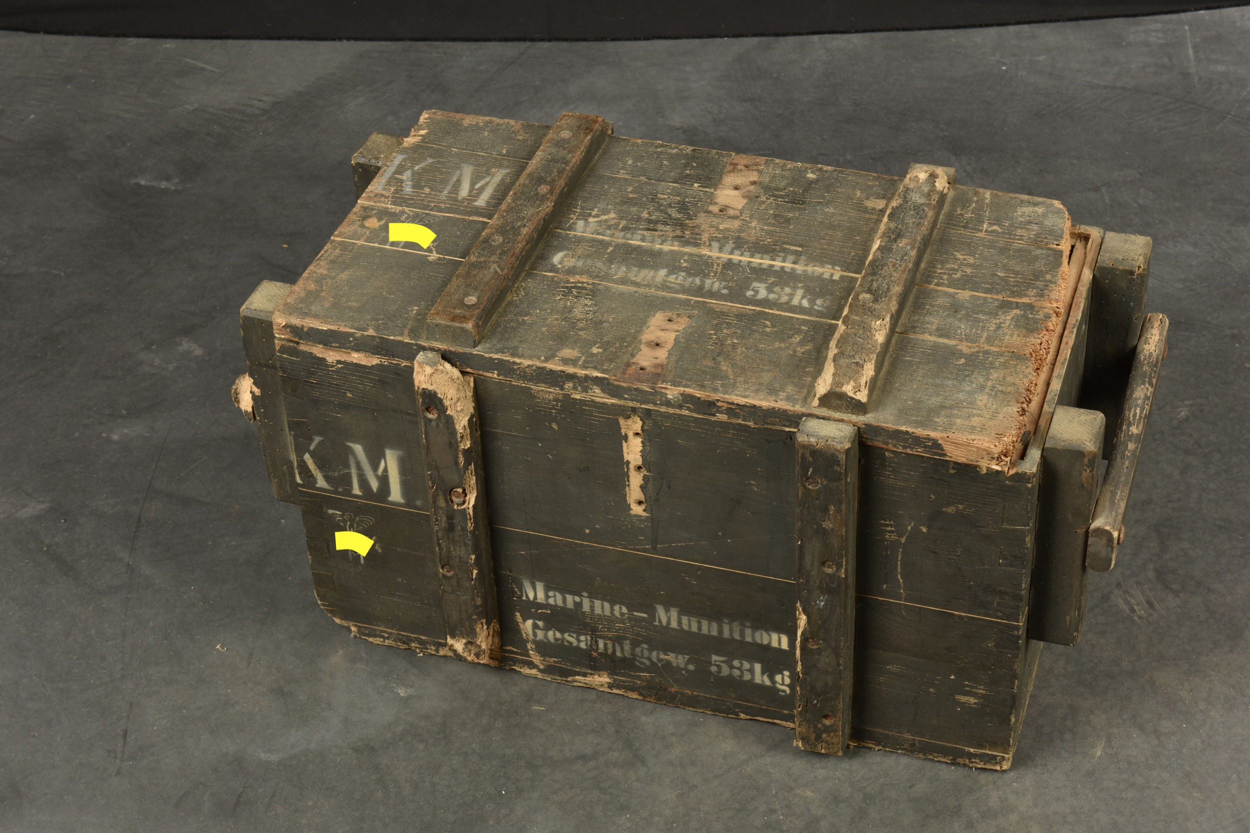 Caisse Kriegsmarine. En bois, nombreux manques et trous de vers. Couvercle complet marqué Marine Munition avec un beau marquage de la Kriegsmarine. Peinture extérieure à 70%. Poignées en bois. Fermeture absente. A noter une certaine usure et patine de la pièce. Etat II+.