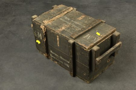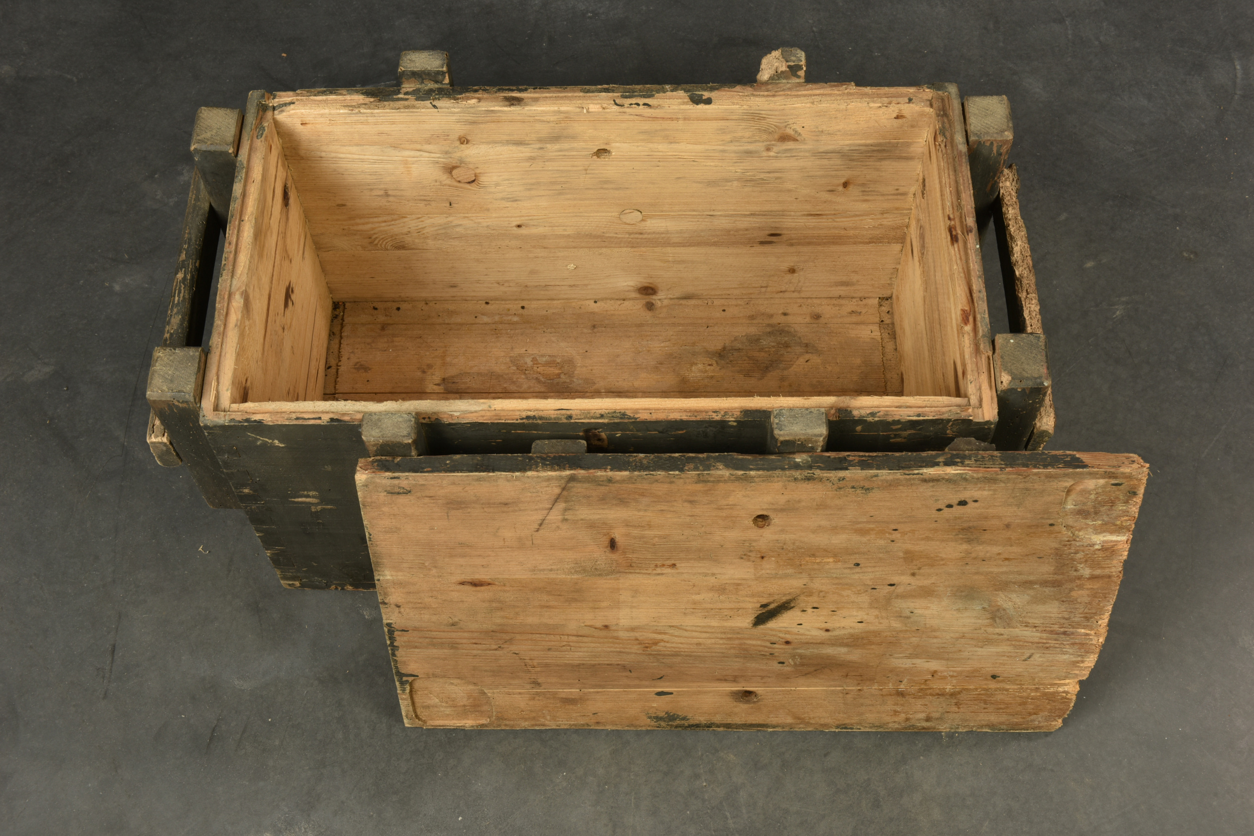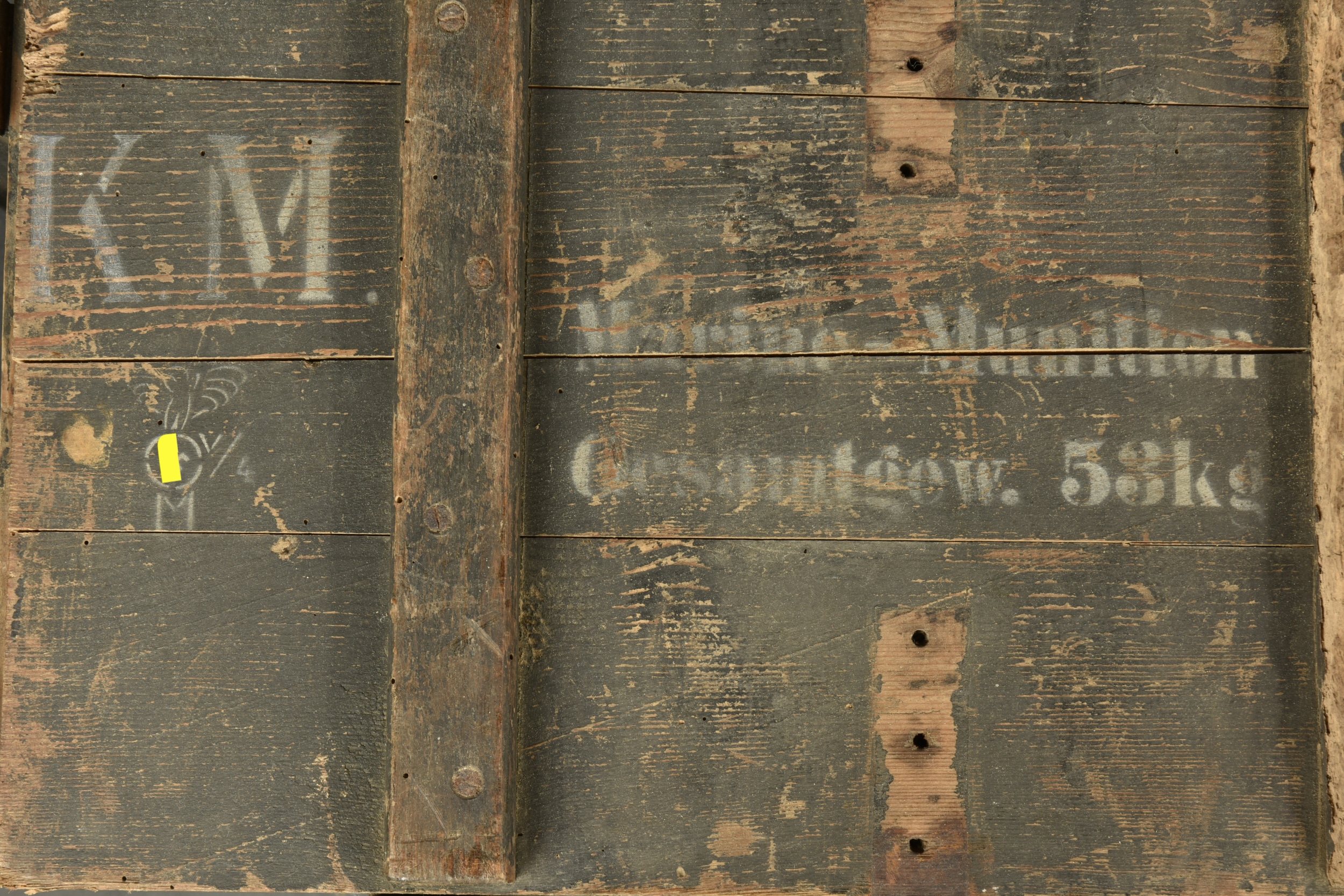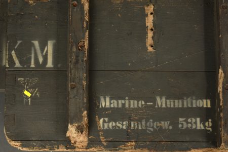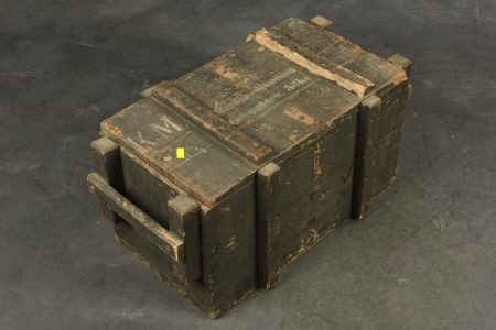 Caisse Kriegsmarine. En bois, nombreux manques et trous de vers. Couvercle complet marqué Marine Munition avec un beau marquage de la Kriegsmarine. Peinture extérieure à 70%. Poignées en bois. Fermeture absente. A noter une certaine usure et patine de la pièce. Etat II+.