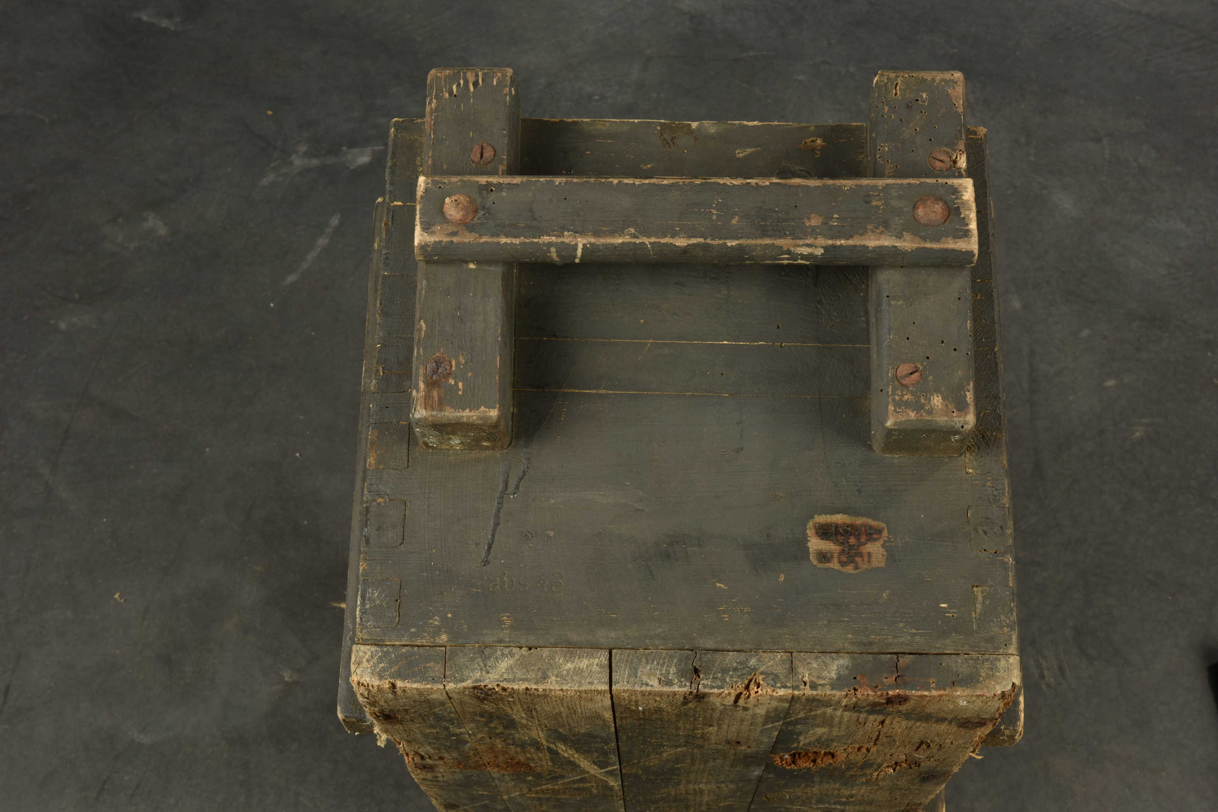 Caisse Kriegsmarine. En bois, nombreux manques et trous de vers. Couvercle complet marqué Marine Munition avec un beau marquage de la Kriegsmarine. Peinture extérieure à 70%. Poignées en bois.... en savoir plus