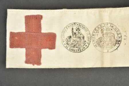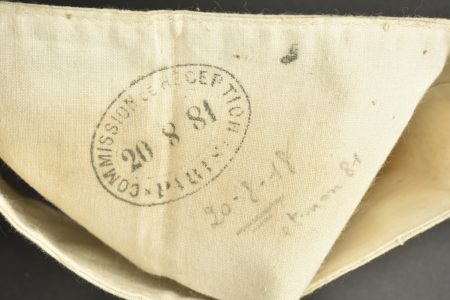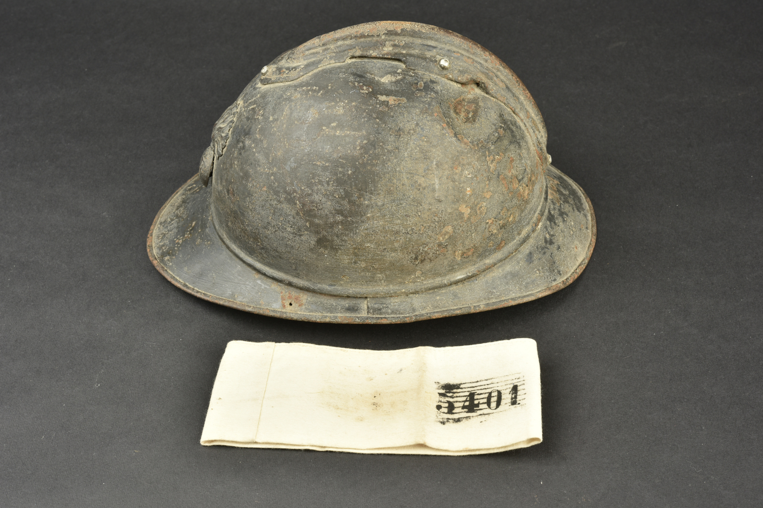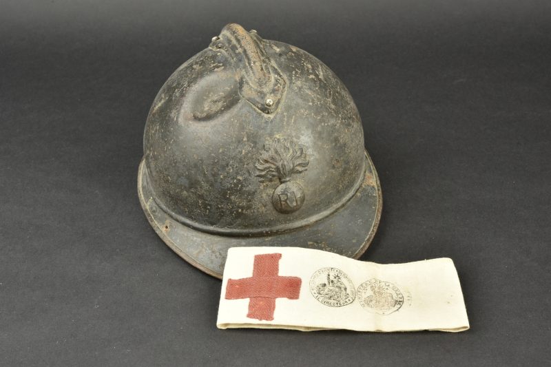 Casque Adrian 1915 infanterie. Casque modèle 1915, attribut d’infanterie modèle 1915, peinture du second type recouvrant le bleu horizon d’usine. Coiffe du premier type à sept dents de loup dont une accidentée, quatre gaufrettes en aluminium. A noter un choc sur le dessus du casque ainsi que deux trous sur la visière destinés à y visser une plaque commémorative. On y joint un brassard du service de santé tamponné du premier corps d’armée et daté du 20 août 1881.