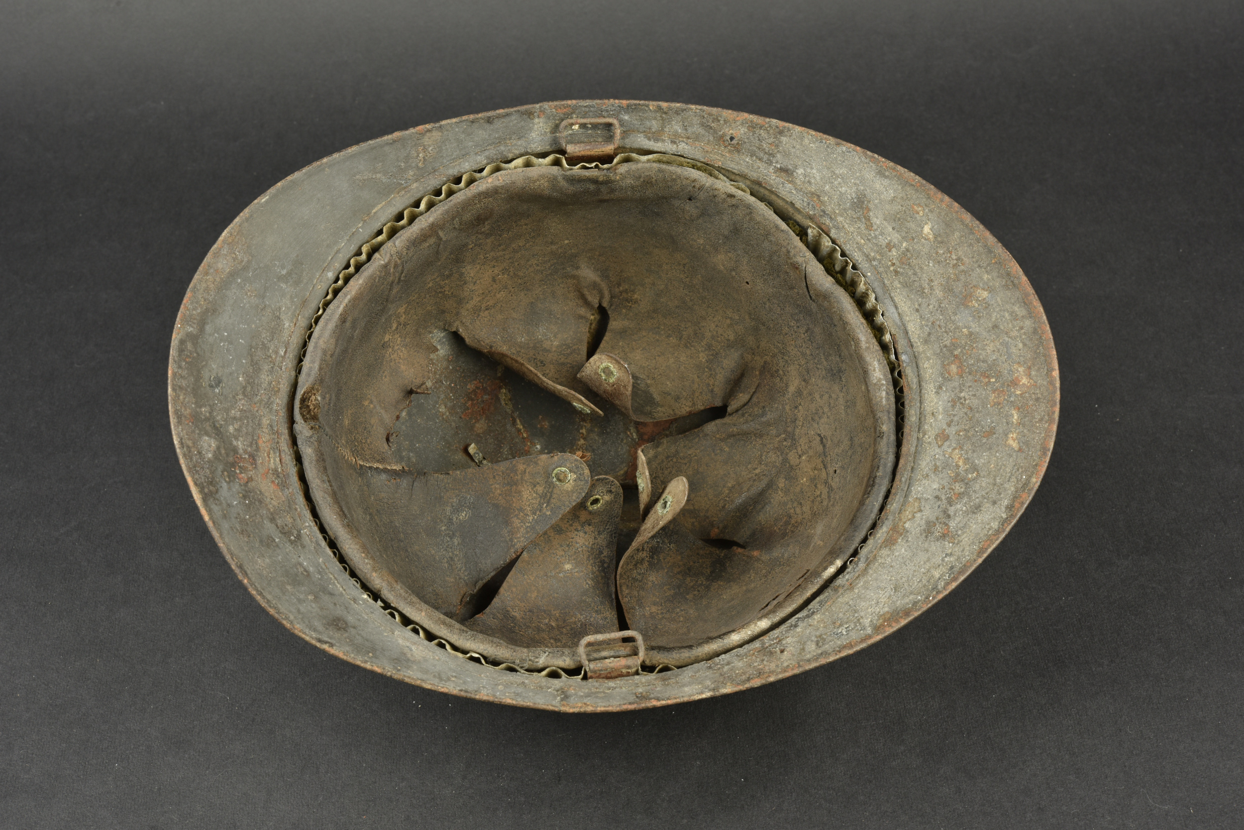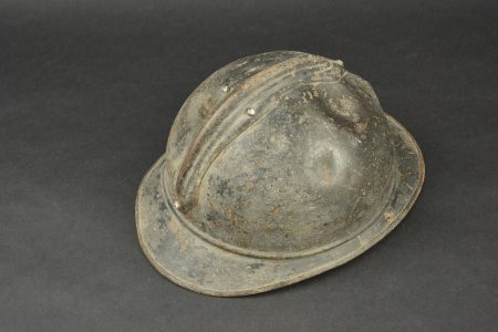 Casque Adrian 1915 infanterie. Casque modèle 1915, attribut d’infanterie modèle 1915, peinture du second type recouvrant le bleu horizon d’usine. Coiffe du premier type à sept dents... en savoir plus
