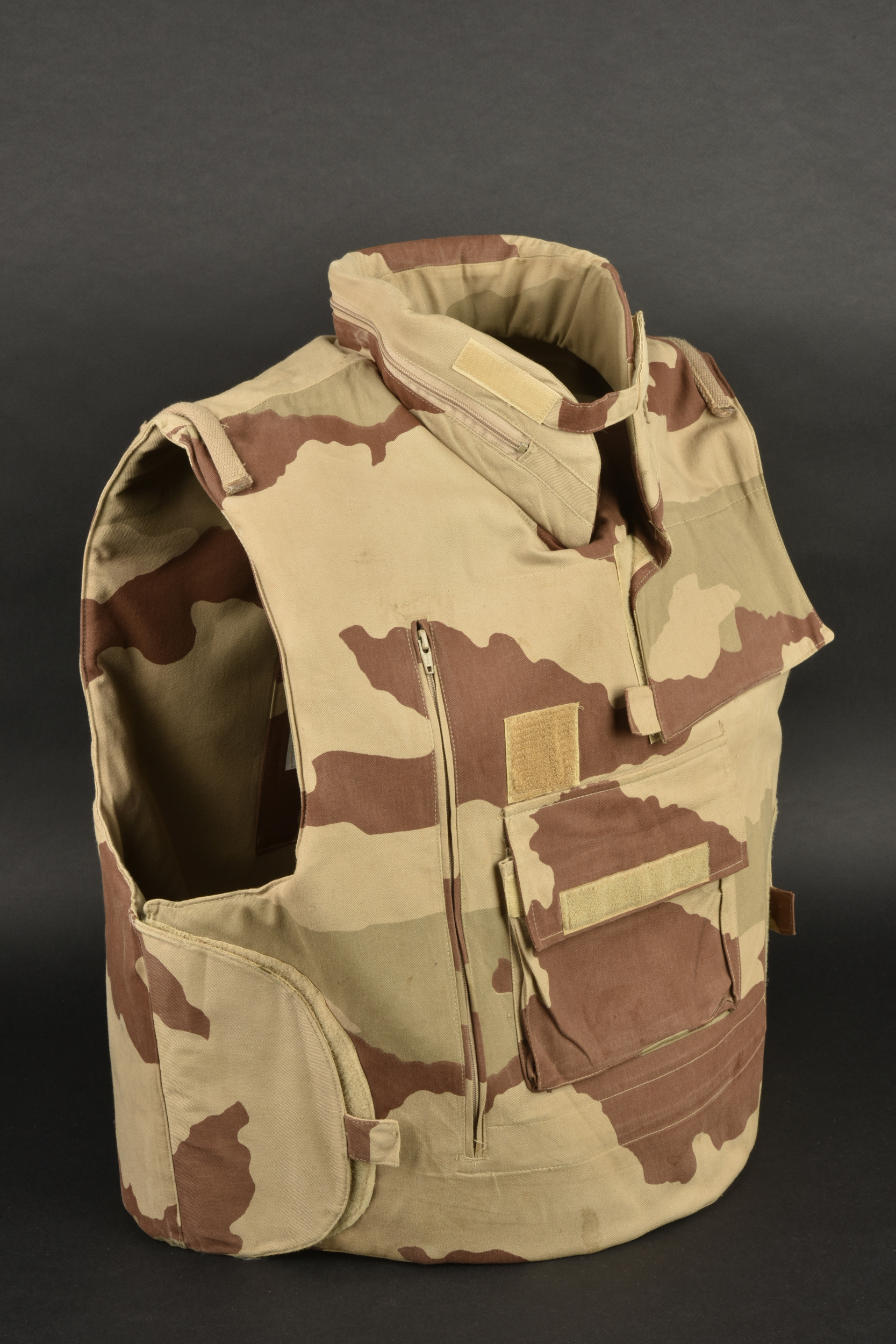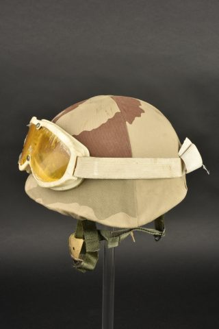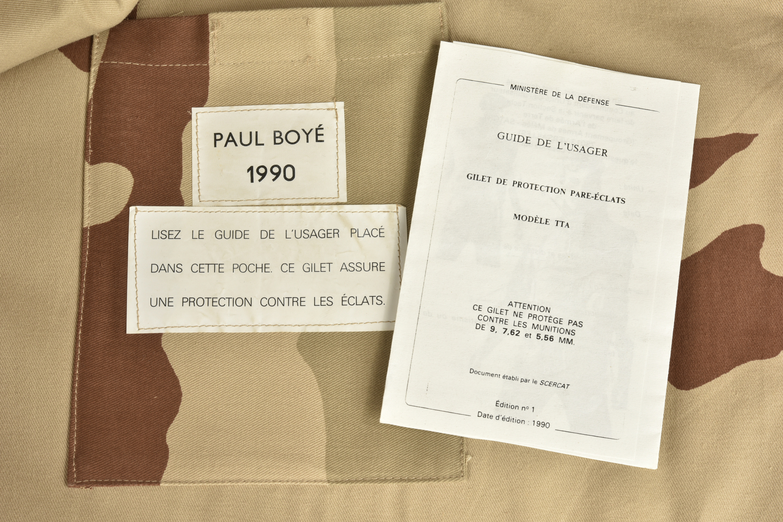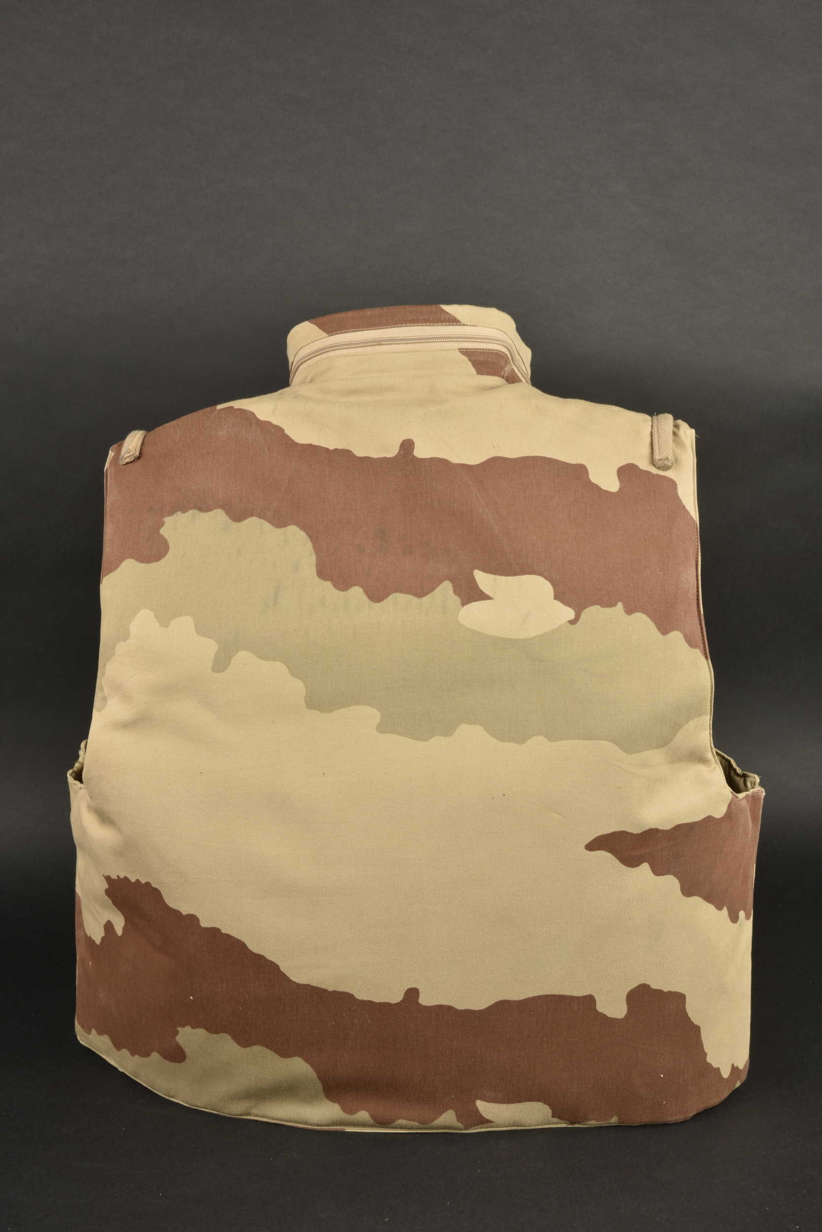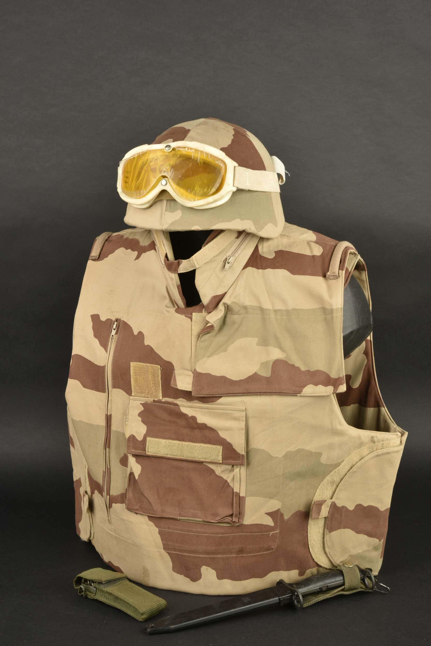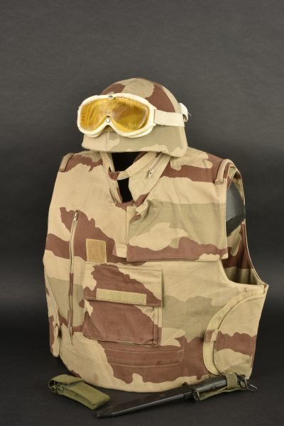 Casque français F1 et gilet pare éclats camouflage désert, lunettes et baïonnette Famas