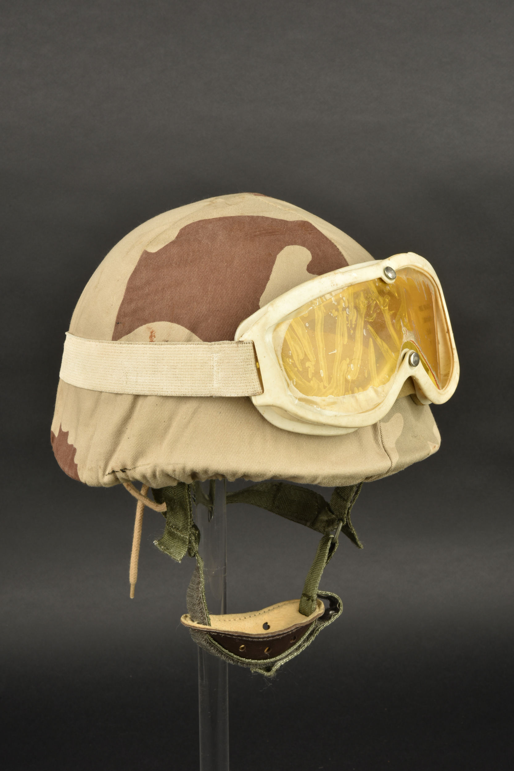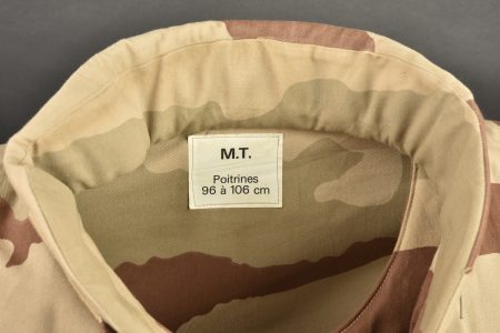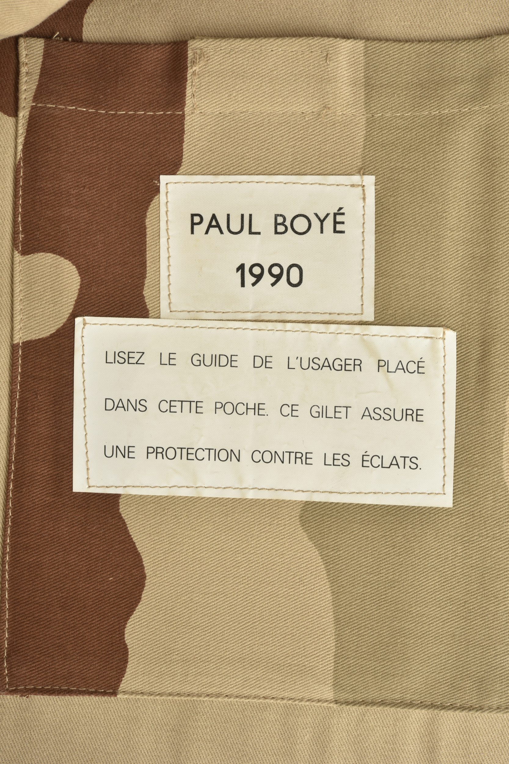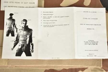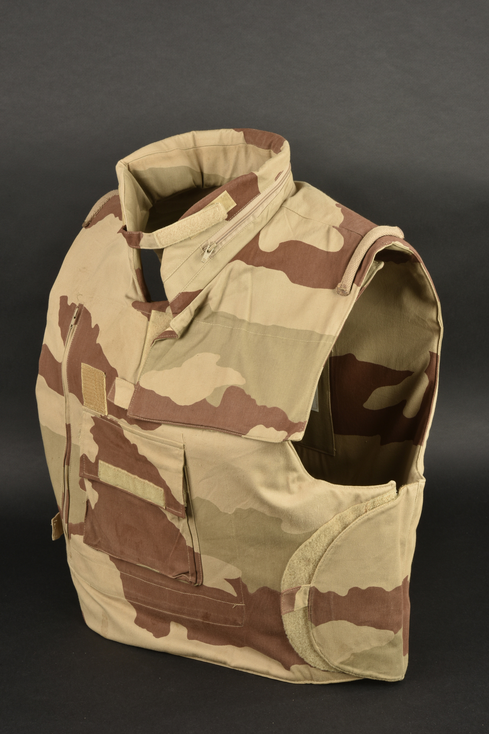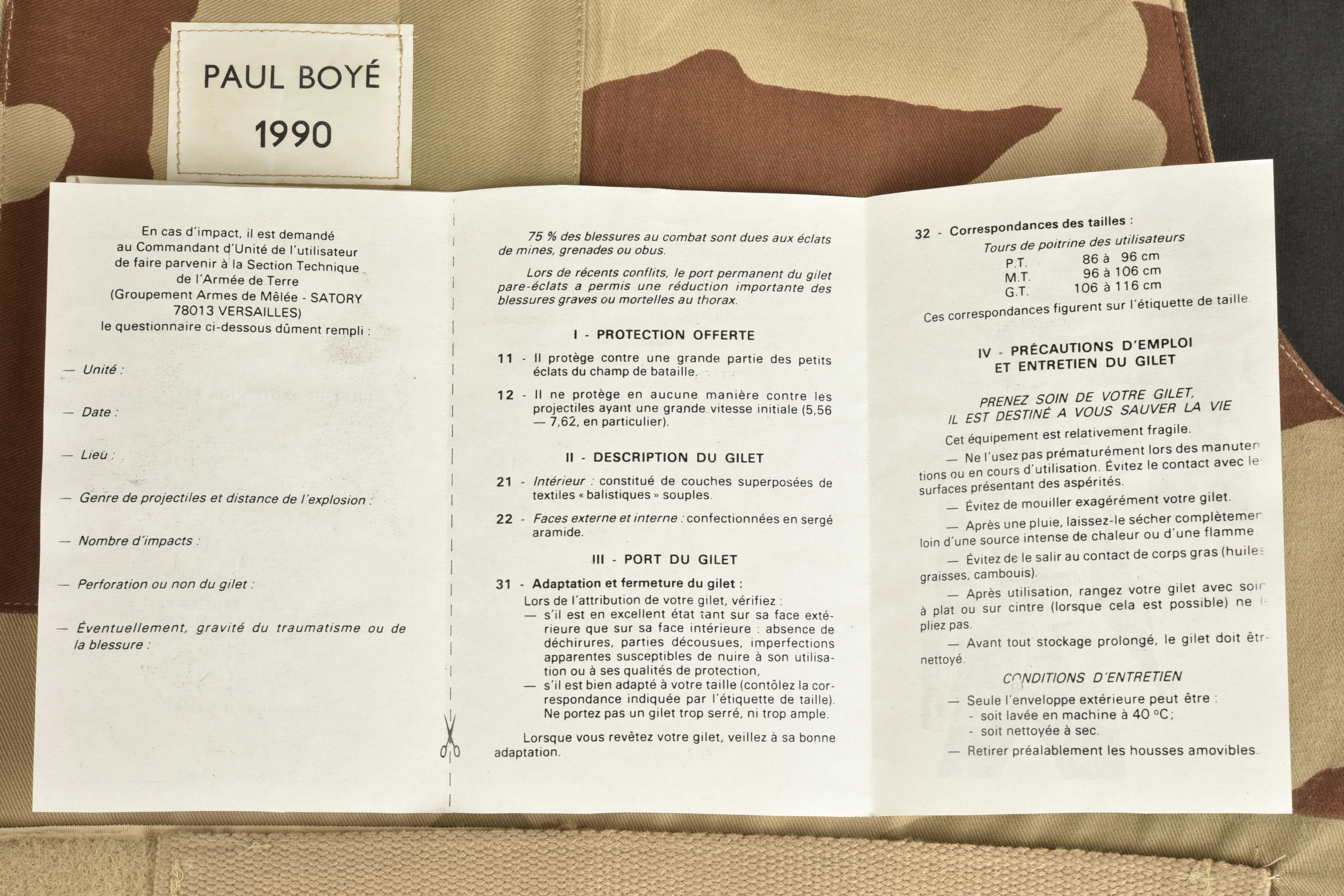 Casque français F1 et gilet pare éclats camouflage désert, lunettes et baïonnette Famas