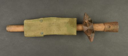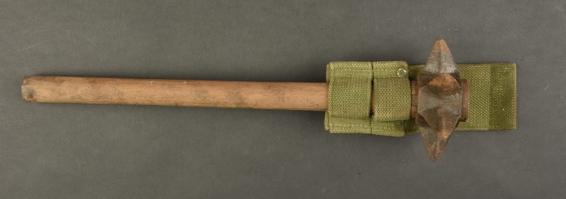 Casse tête anglais et porte fourreau en web.Casse tête anglais constitué d’un manche d’outil individuel en bois et d’une masse en fonte formant une bague garnie de 6 pointes . Authenticité non garantie. Avec un porte fourreau de baïonnette en Web