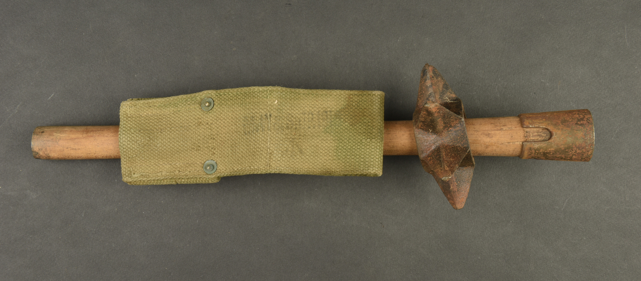 Détails de la vente >Casse tête anglais et porte fourreau en web.Casse tête anglais constitué d’un manche d’outil individuel en bois et d’une masse en fonte formant une bague garnie de 6 pointes .... en savoir plus