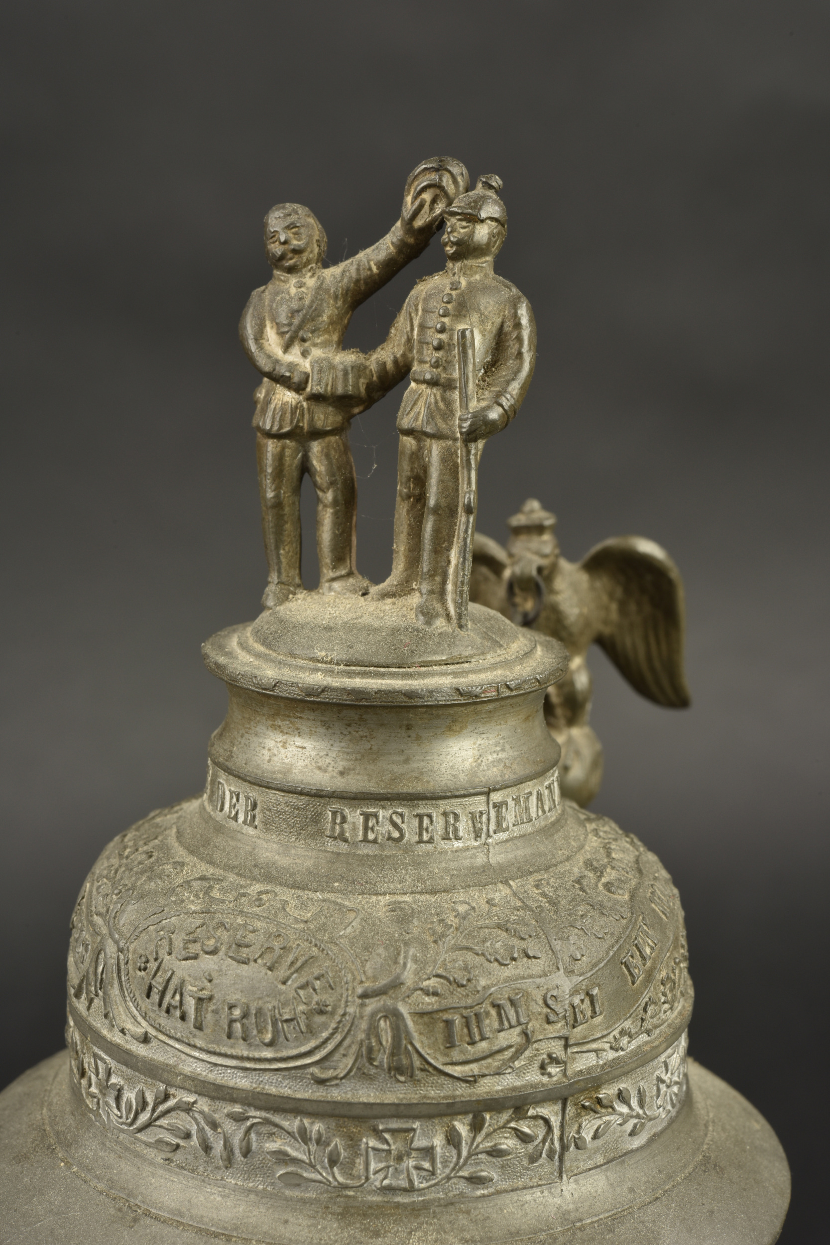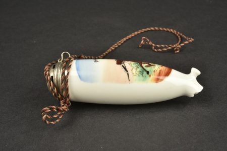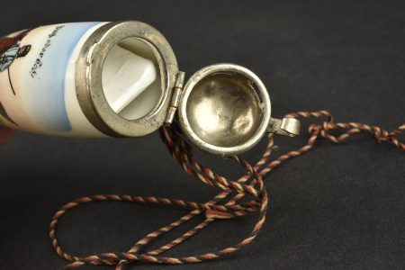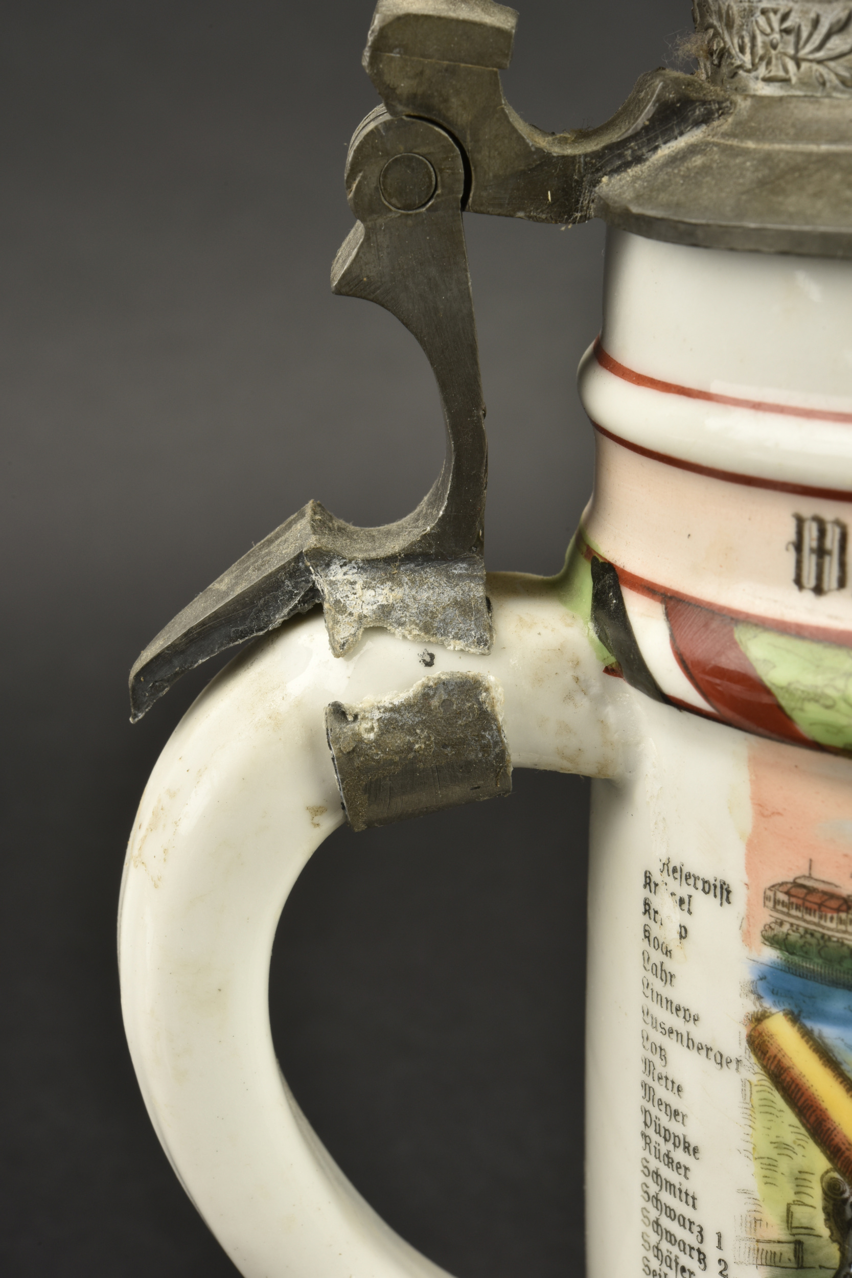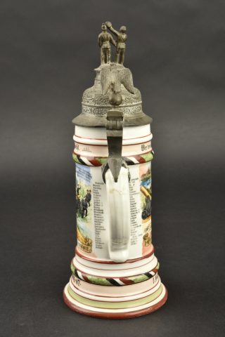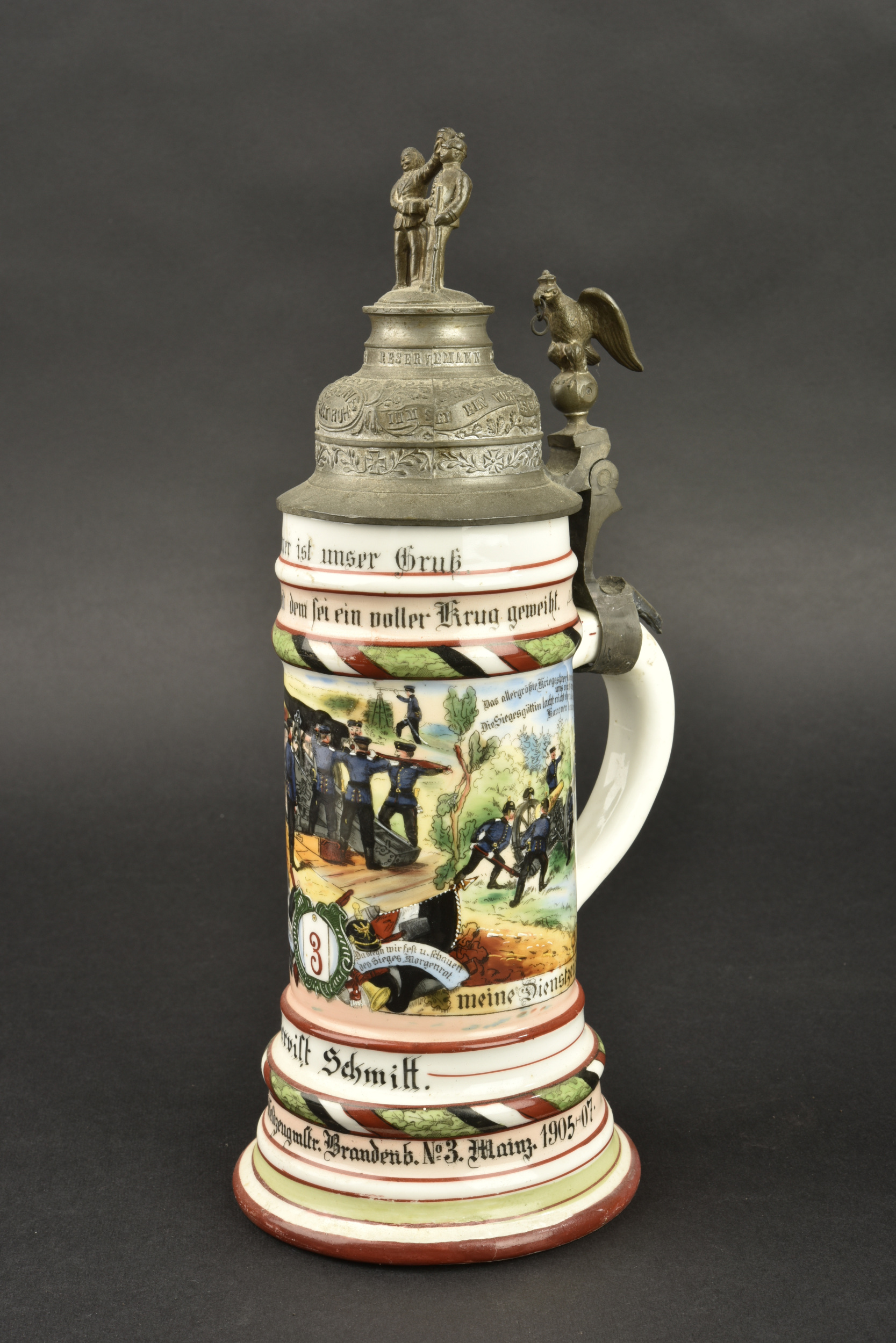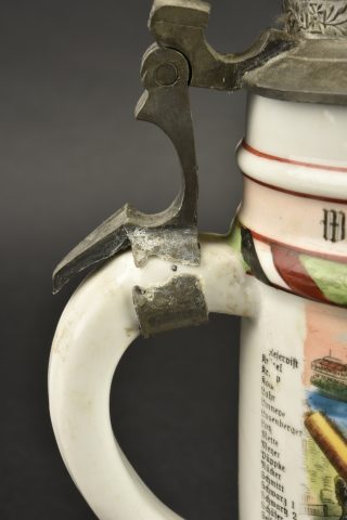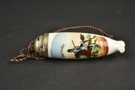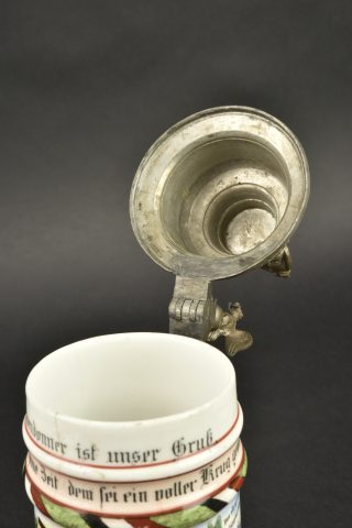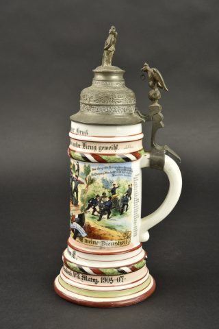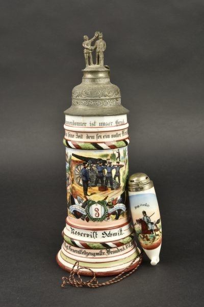 Chope de réserviste du 3e régiment d’artillerie à pied et pipe de Jäger zu Pferde. Chope en porcelaine blanche sérigraphiée et rehaussée à la main. En bon état, une fêlure au col. Marquée du Fuss Artillerie Regimlent Nr 3 de Mainz et datée 1905-1907. Le couvercle est d’époque mais la bague de maintien autour de l’anse est coupée. Accompagnée d’un fourneau de pipe à motif de Jäger zu Pferde, sérigraphie rehaussée à la main, devise Sieg oder Todt. Avec son couvercle. Tube cassé.