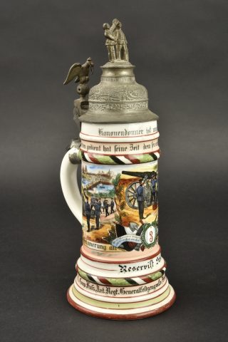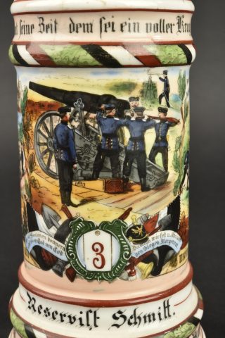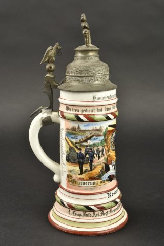 Détails de la vente >Chope de réserviste du 3e régiment d’artillerie à pied et pipe de Jäger zu Pferde. Chope en porcelaine blanche sérigraphiée et rehaussée à la main. En bon état, une fêlure au col.... en savoir plus