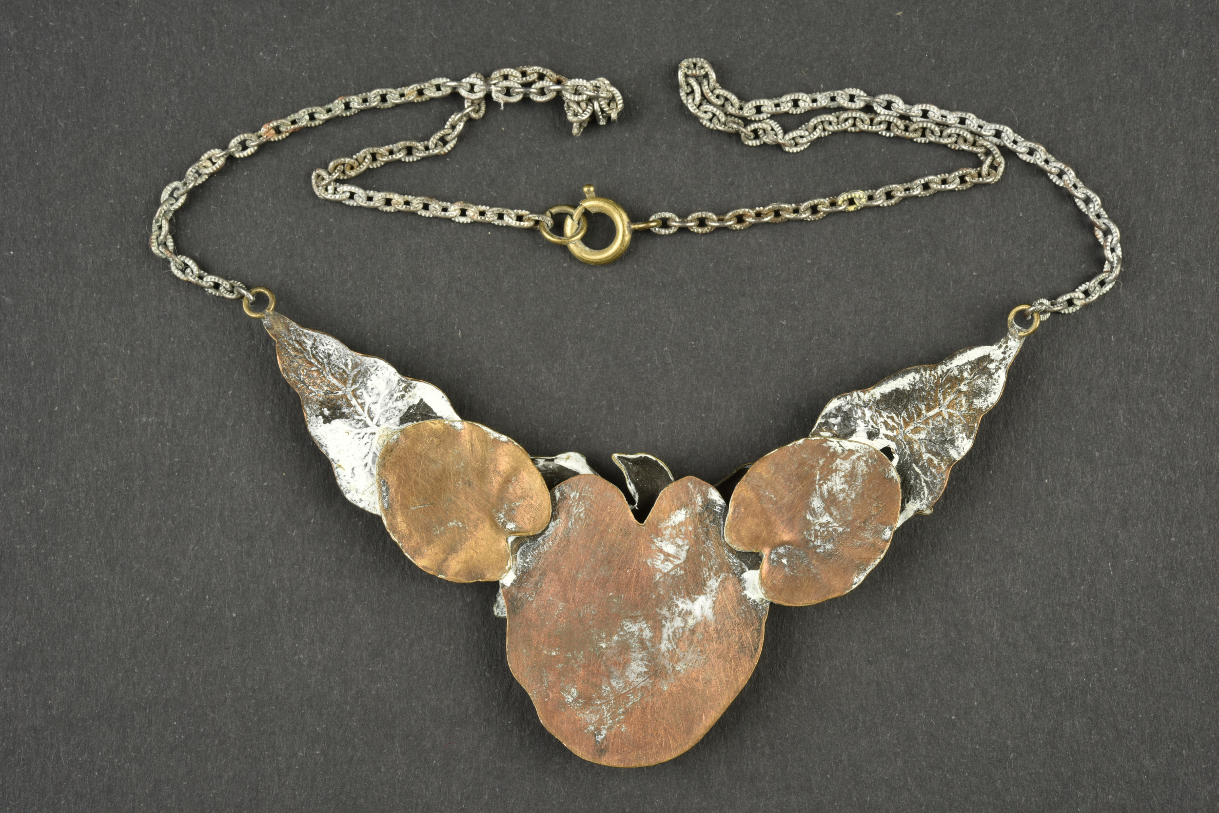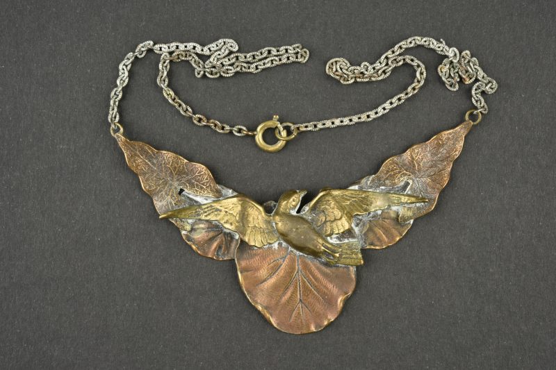 Détails de la vente >Collier parure en artisanat de tranchée. En cuivre et laiton représentant un oiseau sur des feuilles. Chaînette en métal blanc. À nettoyer