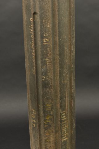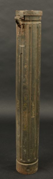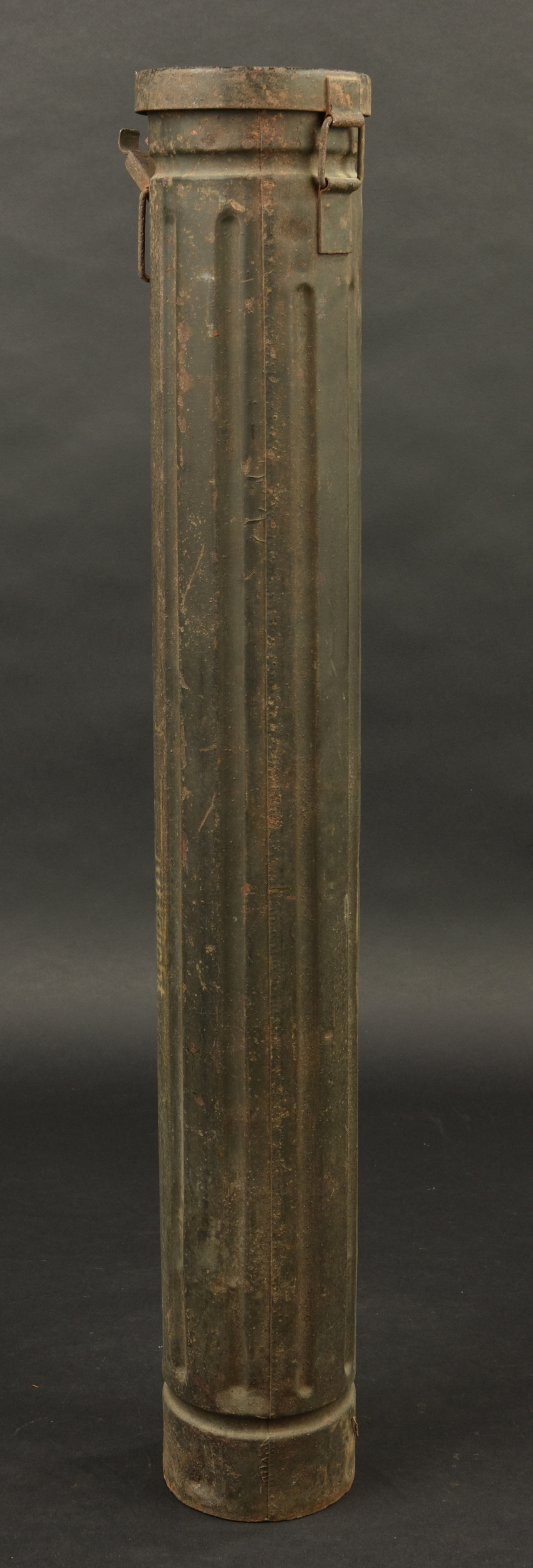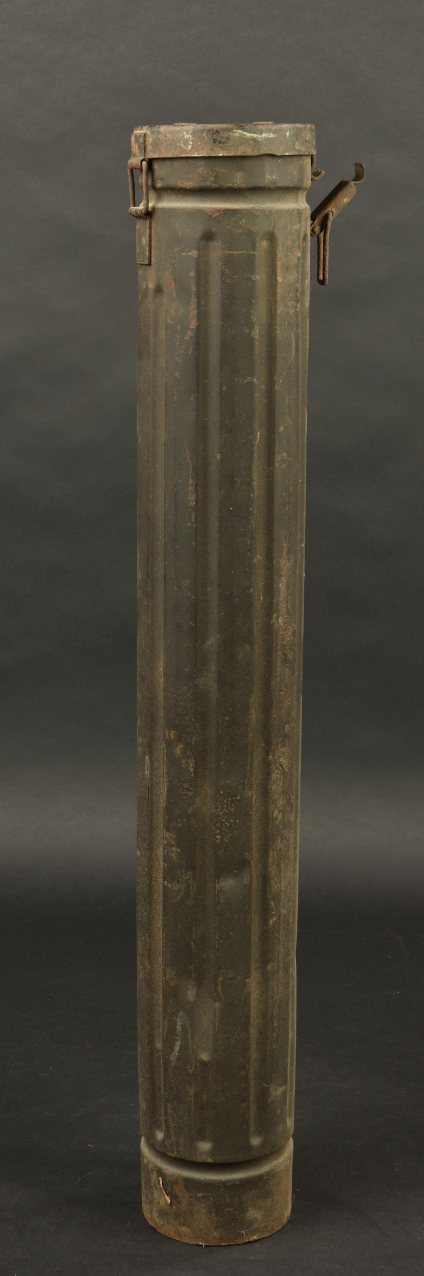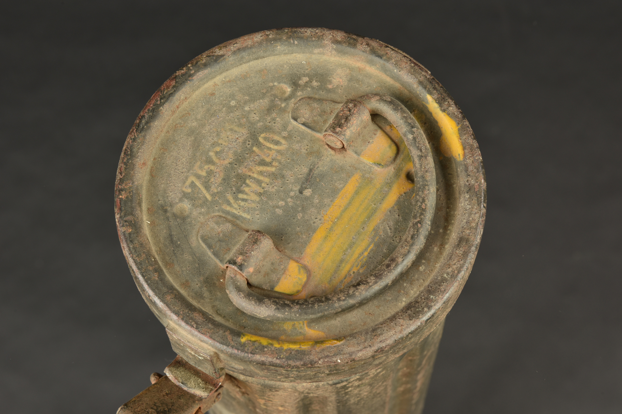 Container allemand. En métal, peinture Feldgrau à 70%. Quelques marques d’oxydation. Marquages partiellement illisibles. Couvercle complet, avec son crochet. Marquages 7,5 KWK 40. Bande jaune au niveau de la poignée. Etiquette incomplète, datée 1940. A noter une certaine usure et patine de la pièce. Etat II+.