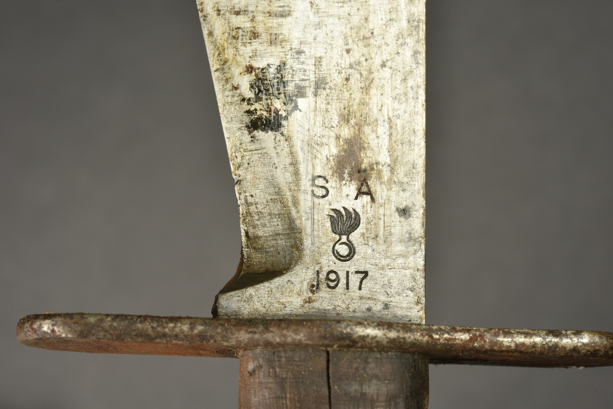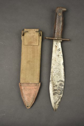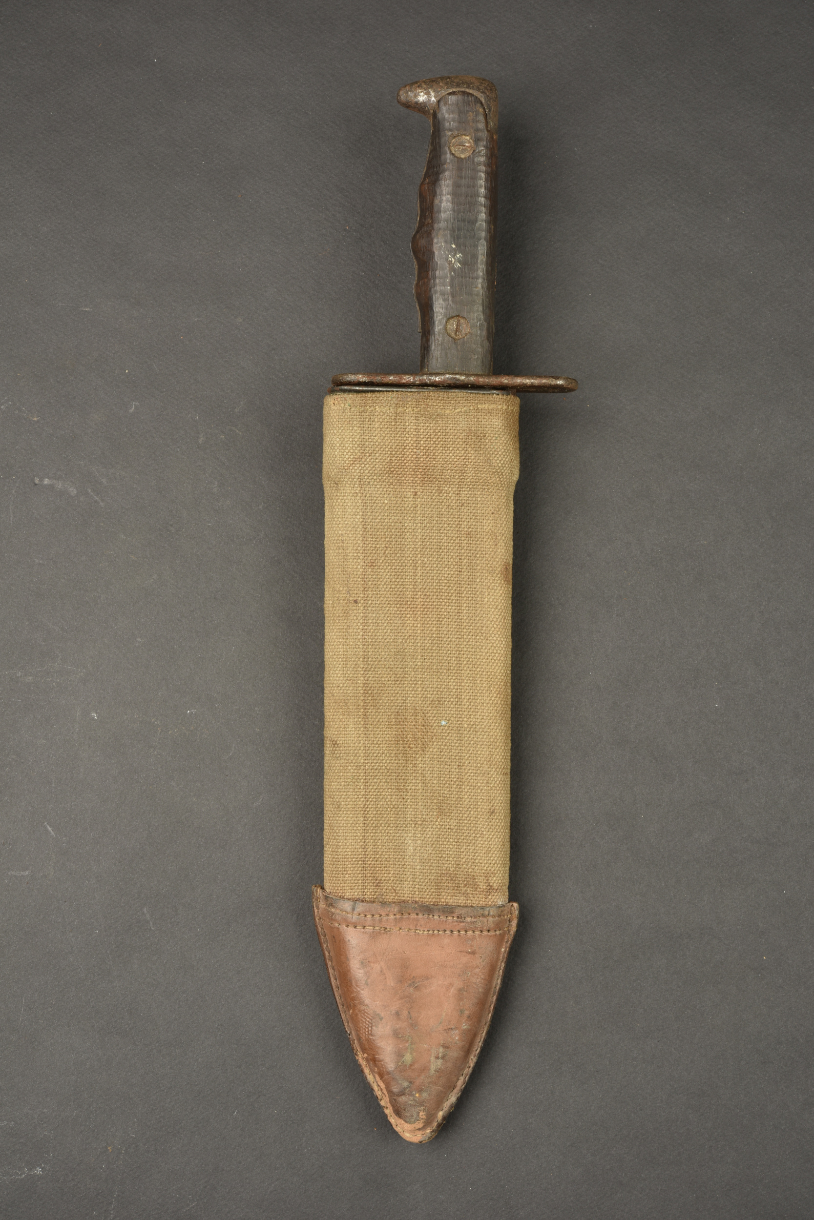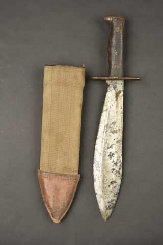 Couteau Bolo US 1917. Poignée en bois maintenue par deux rivets. Lame avec corrosion. Fabrication S.A. Springfield Armory daté 1917. Fourreau recouvert de toile kaki. Crochet de fixation au ceinturon présent. Renfort de fourreau en cuir marqué Brauer Bros 1917, et lettres DM. Bon état