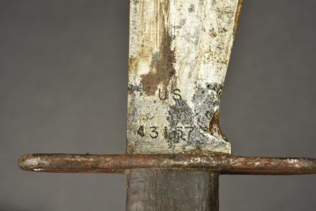 Couteau Bolo US 1917. Poignée en bois maintenue par deux rivets. Lame avec corrosion. Fabrication S.A. Springfield Armory daté 1917. Fourreau recouvert de toile kaki. Crochet de fixation au... en savoir plus