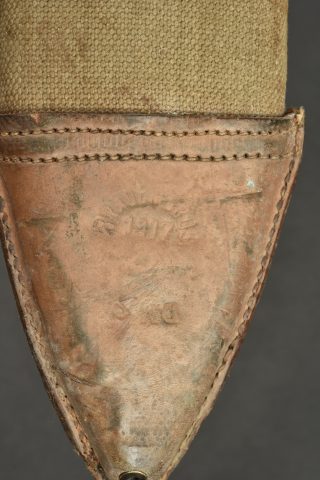 Détails de la vente >Couteau Bolo US 1917. Poignée en bois maintenue par deux rivets. Lame avec corrosion. Fabrication S.A. Springfield Armory daté 1917. Fourreau recouvert de toile kaki. Crochet de fixation au... en savoir plus