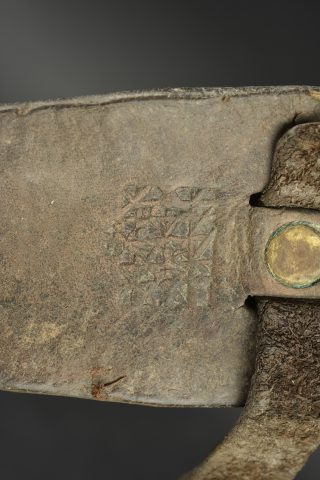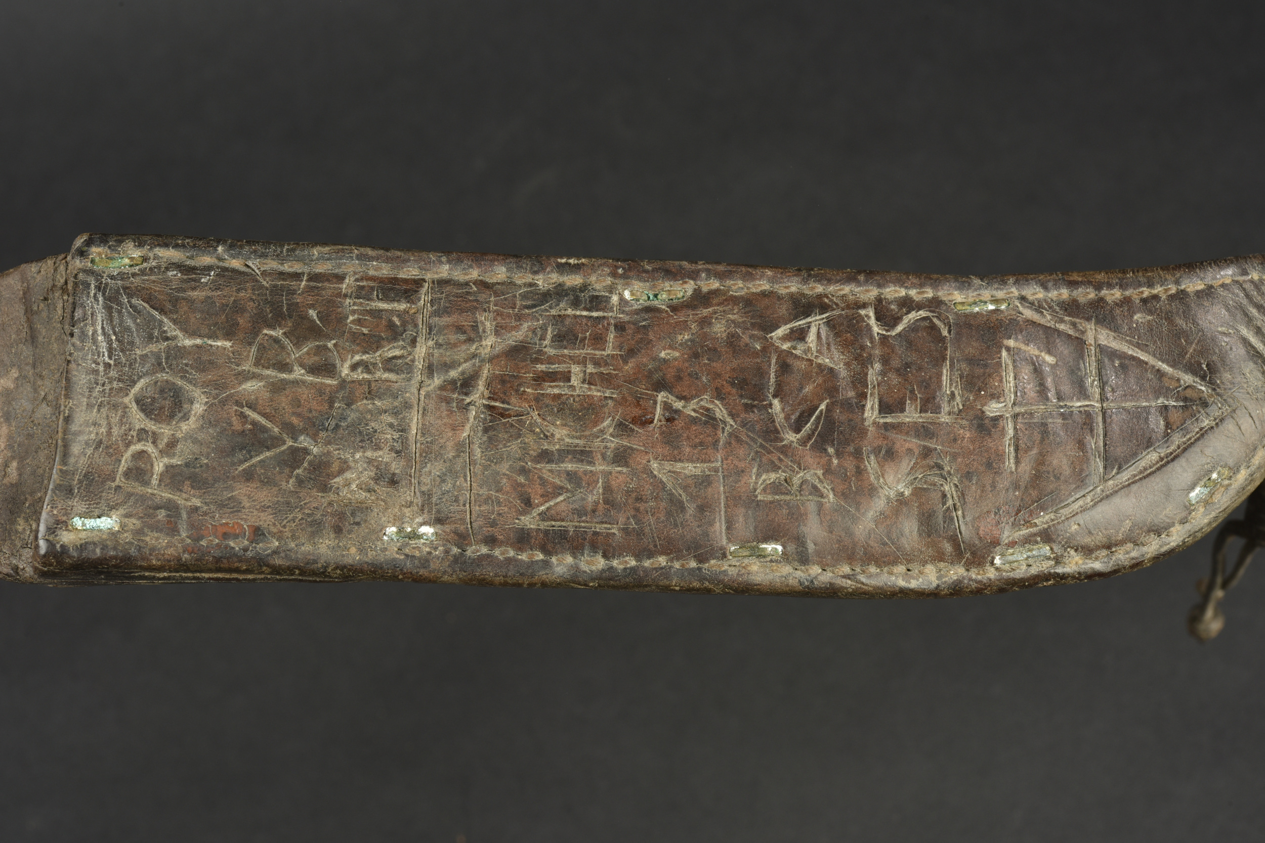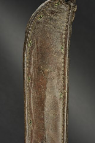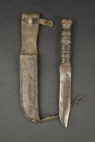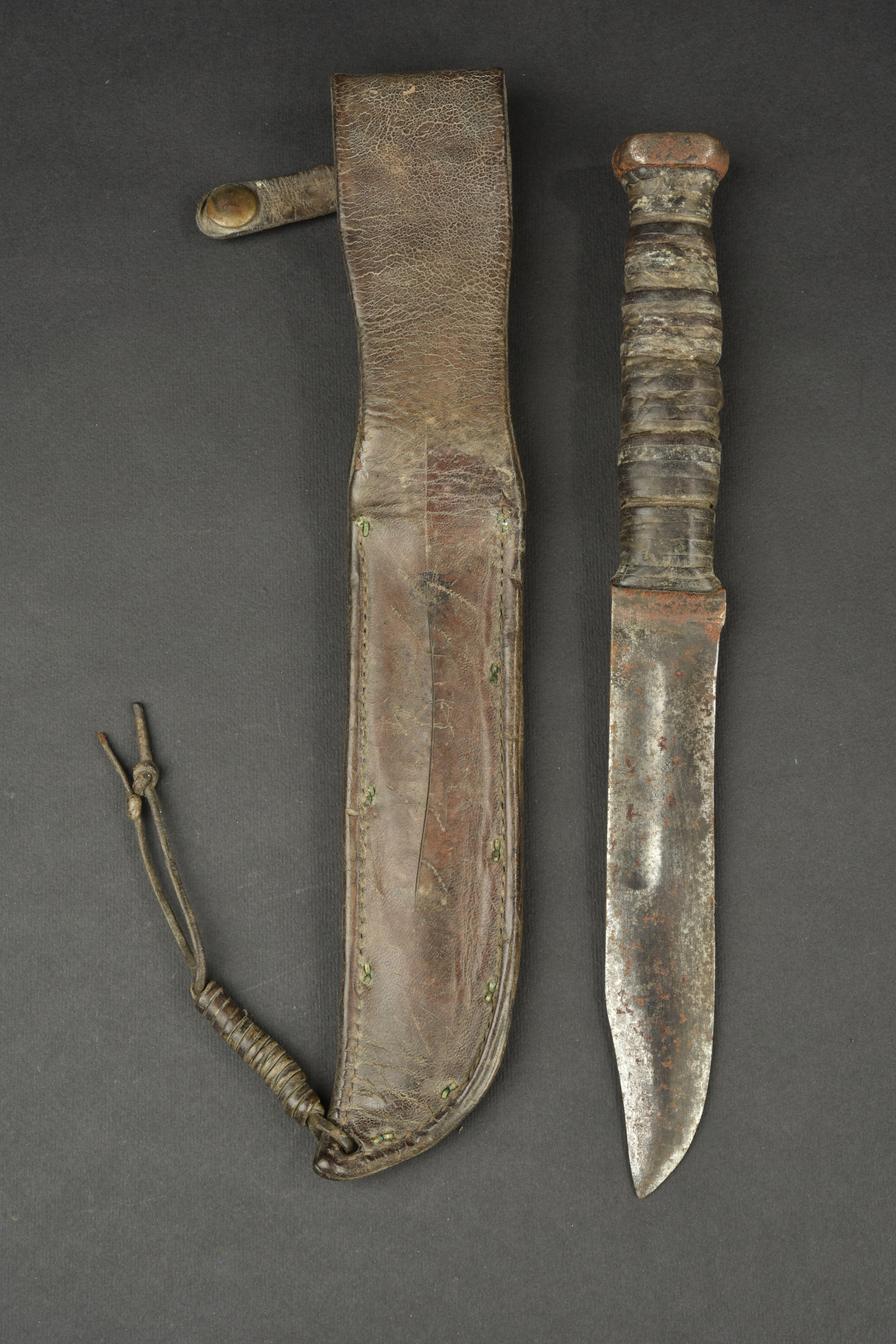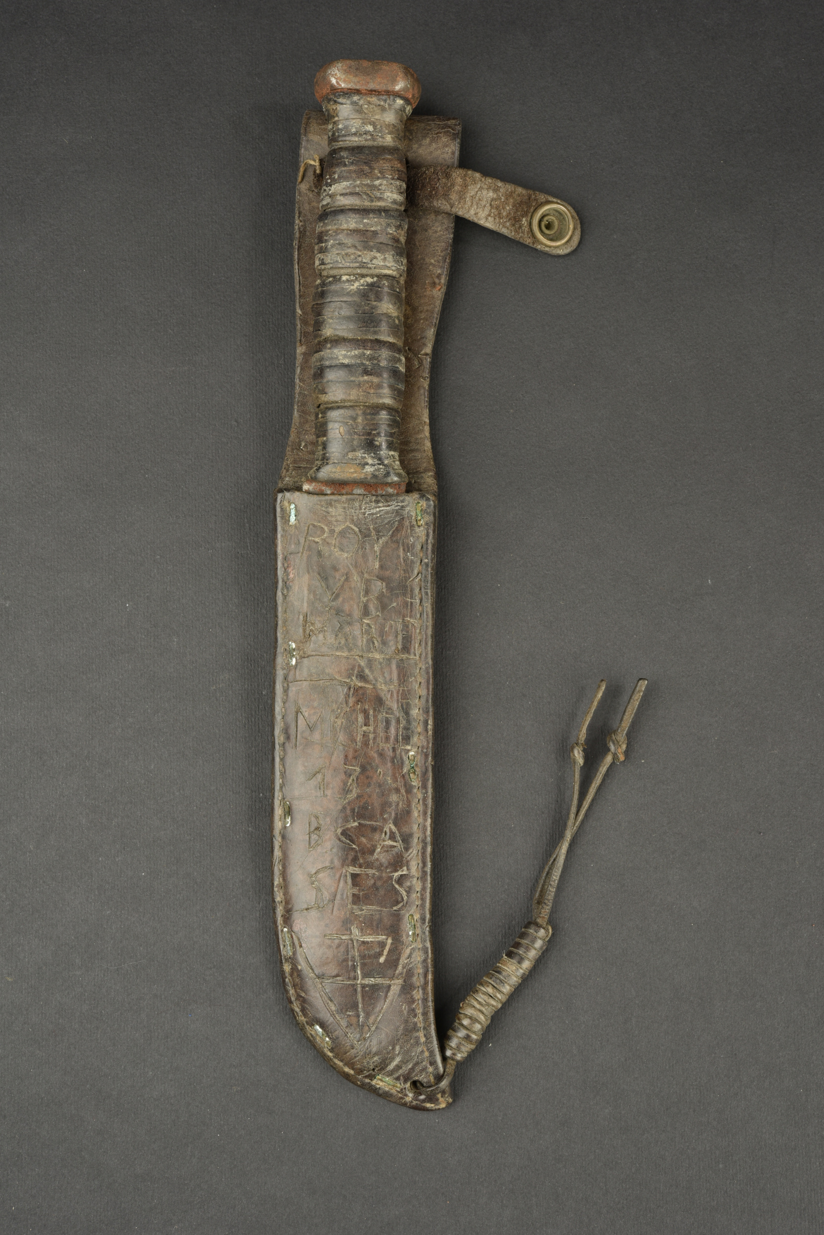 Couteau FFI 13ème BCA. Couteau américain usagé de type MK2, garde supprimé et lame aiguisée. Fourreau en cuir personnalisé par le soldat français, on peut lire Roy VB Mort Michel 13ème BCA SES ainsi qu’une croix de Lorraine. Patte de maintien accidentée.