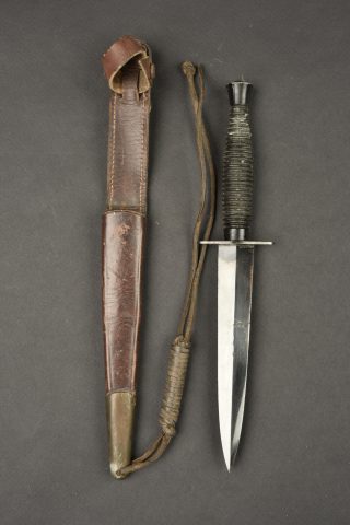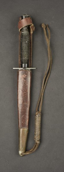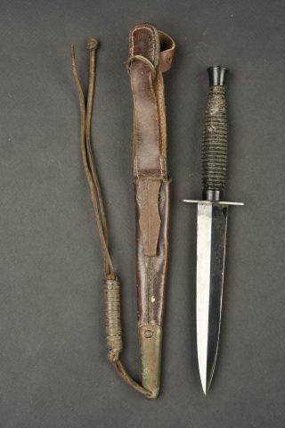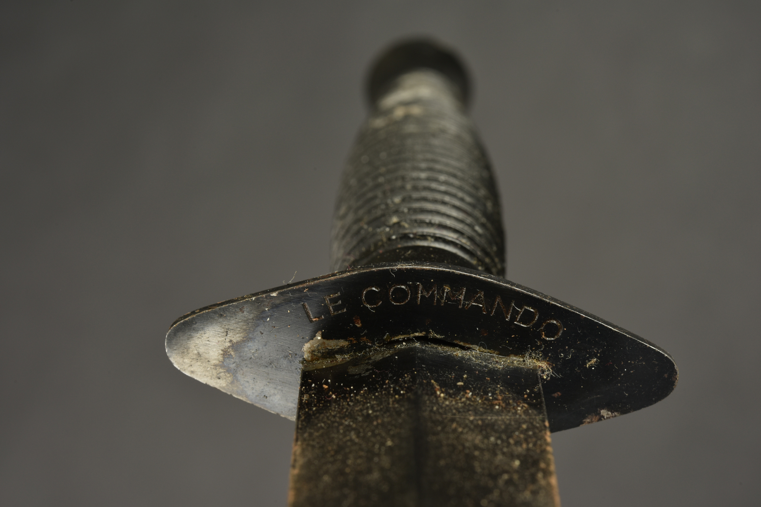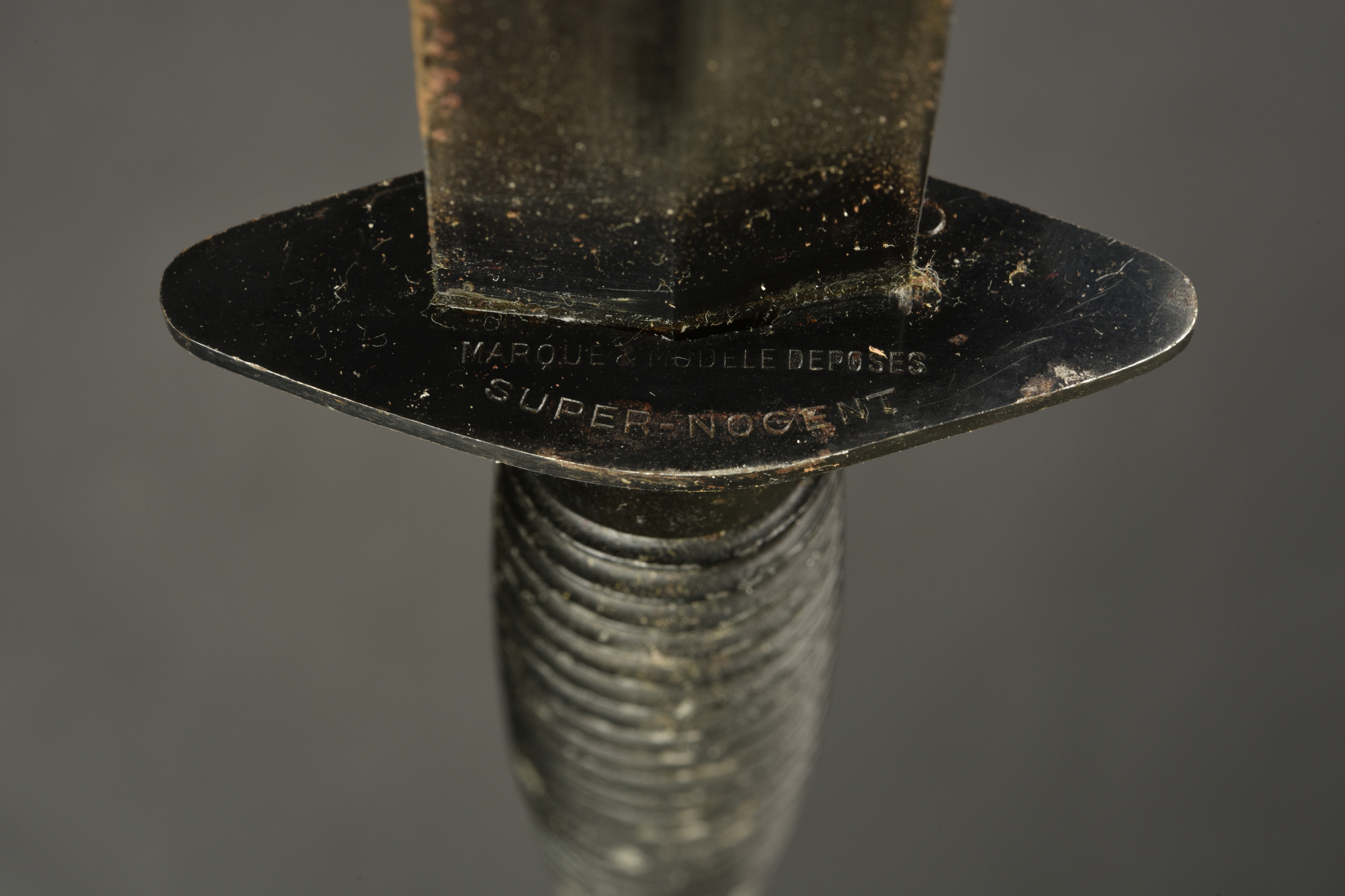 Dague Le Commando Super Nogent avec fourreau 1er type. Lame en acier noirci, marquage sur la garde Le Commando marque et modèle déposé Super Nogent. Fourreau 1er type en cuir marron avec marquage Le Commando au dos sur le haut de la patte. Patte de maintien de la poignée, pression non fonctionnelle. Crochet métallique au dos. Bouterole laiton avec lacet cuir. Dans son jus.