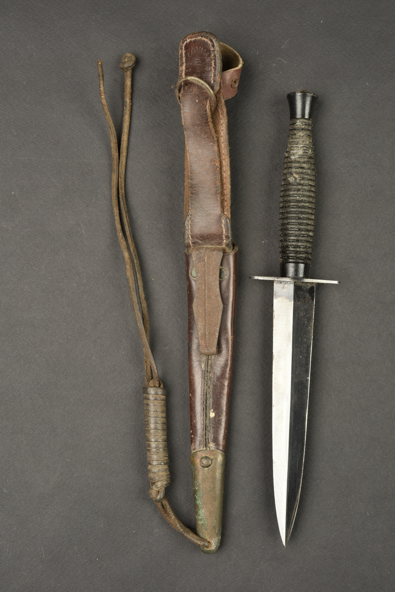 Détails de la vente >Dague Le Commando Super Nogent avec fourreau 1er type. Lame en acier noirci, marquage sur la garde Le Commando marque et modèle déposé Super Nogent. Fourreau 1er type en cuir marron avec... en savoir plus